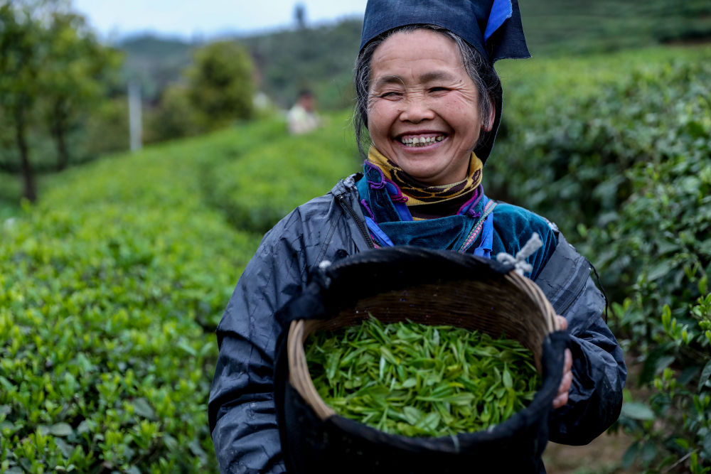 ↑2021年3月21日,贵州省黔东南苗族侗族自治州丹寨县的茶农展示刚采摘的茶青。