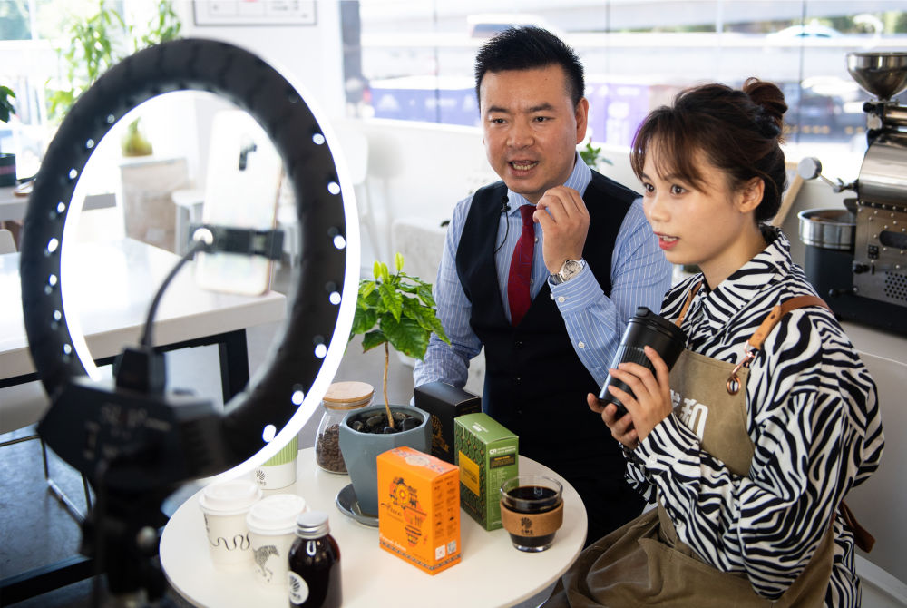 ↑2021年9月24日,在湖南省长沙市高桥大市场,电商在网络上直播推销非洲咖啡。