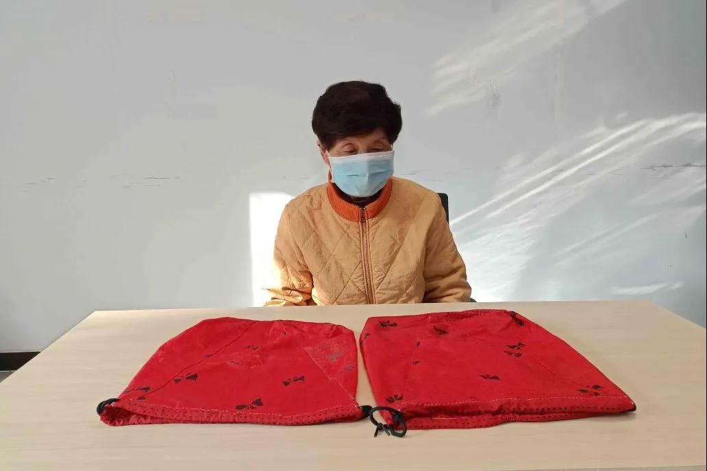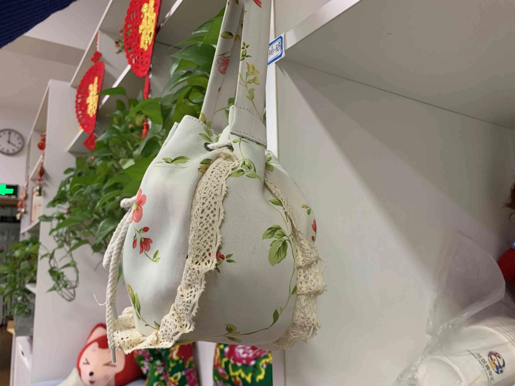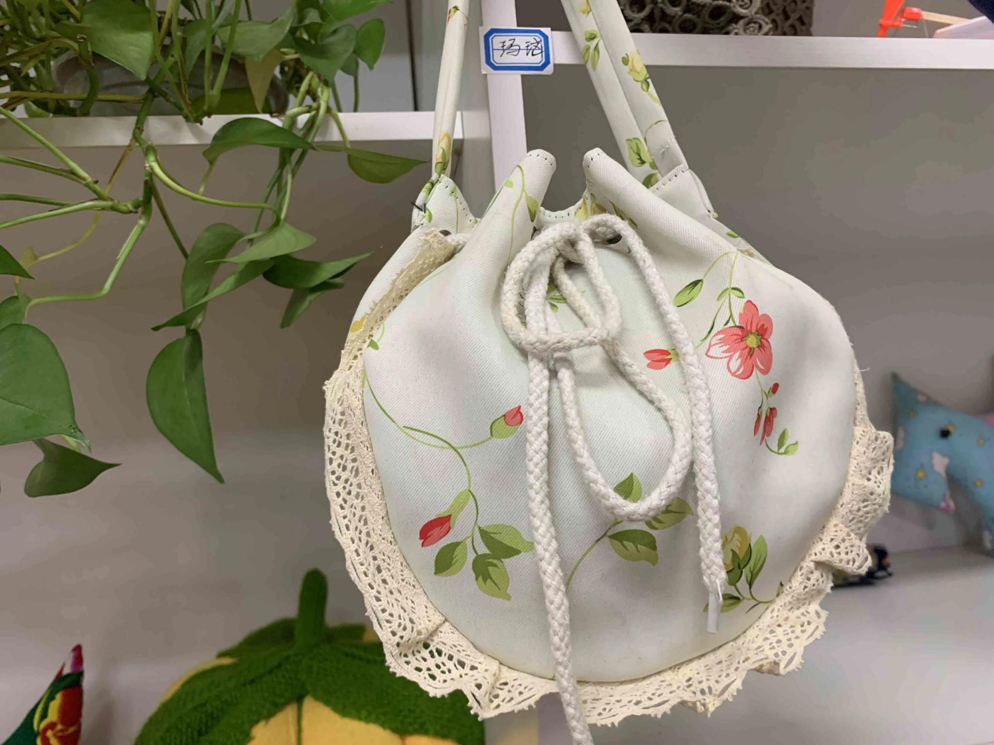 韶九社区居民连云霞,利用废旧窗帘、旧裙子的花边、礼盒上面的包装绳,用针线缝制出了实用的环保手提包。