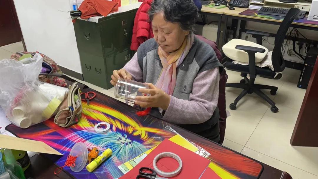 台基厂社区居民尹瑞玲,使用卫生纸纸筒、广告纸、食品塑料瓶等普通常见的生活用品,通过裁剪和粘贴,变成了一个精致可爱、喜气洋洋的小灯笼。作品简单易做,可以设计出不同画面的工艺品,用于家庭装饰,烘托节日气氛、温馨的家庭气氛。