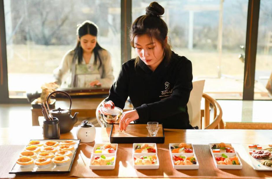 在北京海拔最高的民宿“百花山社”,身穿汉服的女孩演奏古筝,小院主人准备了黄芩茶、咖啡和茶点,邀请游客共享一场惬意温馨的山间茶会,感受乡村慢生活。