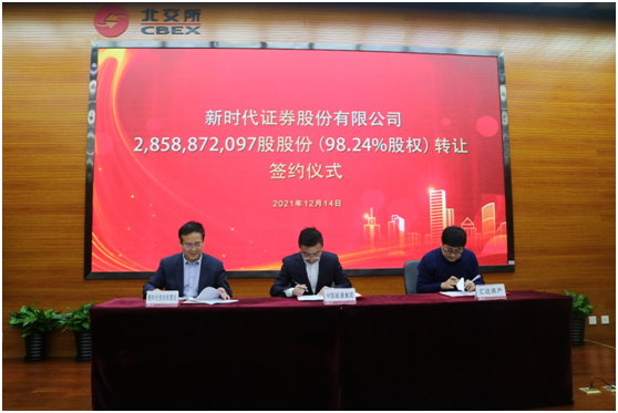 12月14日,新时代证券股份有限公司股权转让项目签约仪式在北京产权交易所举办,央企中国诚通收购新时代证券98.24%的股权。