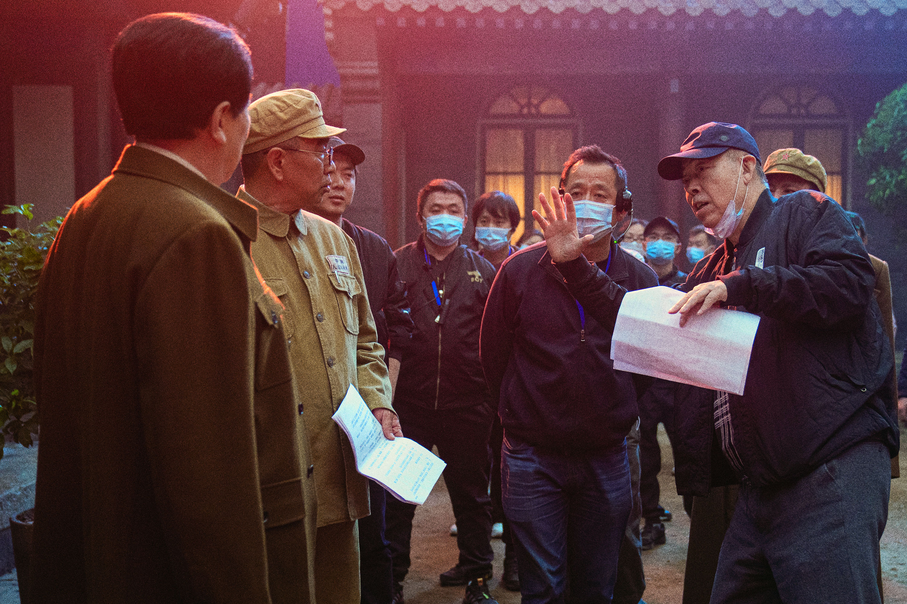 《长津湖》剧组在怀柔有名堂影视园内拍摄,导演陈凯歌在剧组搭建的中南海菊香书屋场景前说戏