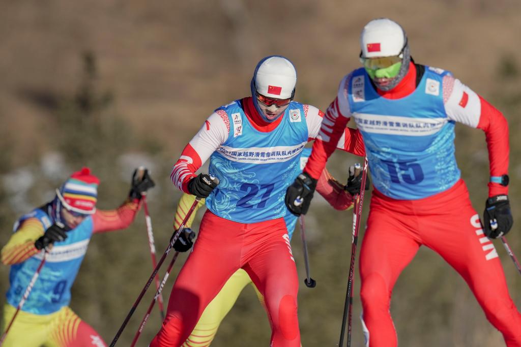 12月12日,越野滑雪国家集训队运动员进行队内模拟赛。新华社记者胡虎虎摄