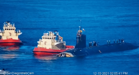 “康涅狄格”号离开关岛后,航行将近一个月,12月12日才抵达圣迭戈。该潜艇受损严重,而根据最新曝光的图片显示,这艘潜艇的艇艏声呐罩已经被完全拆除,如同“断头”。