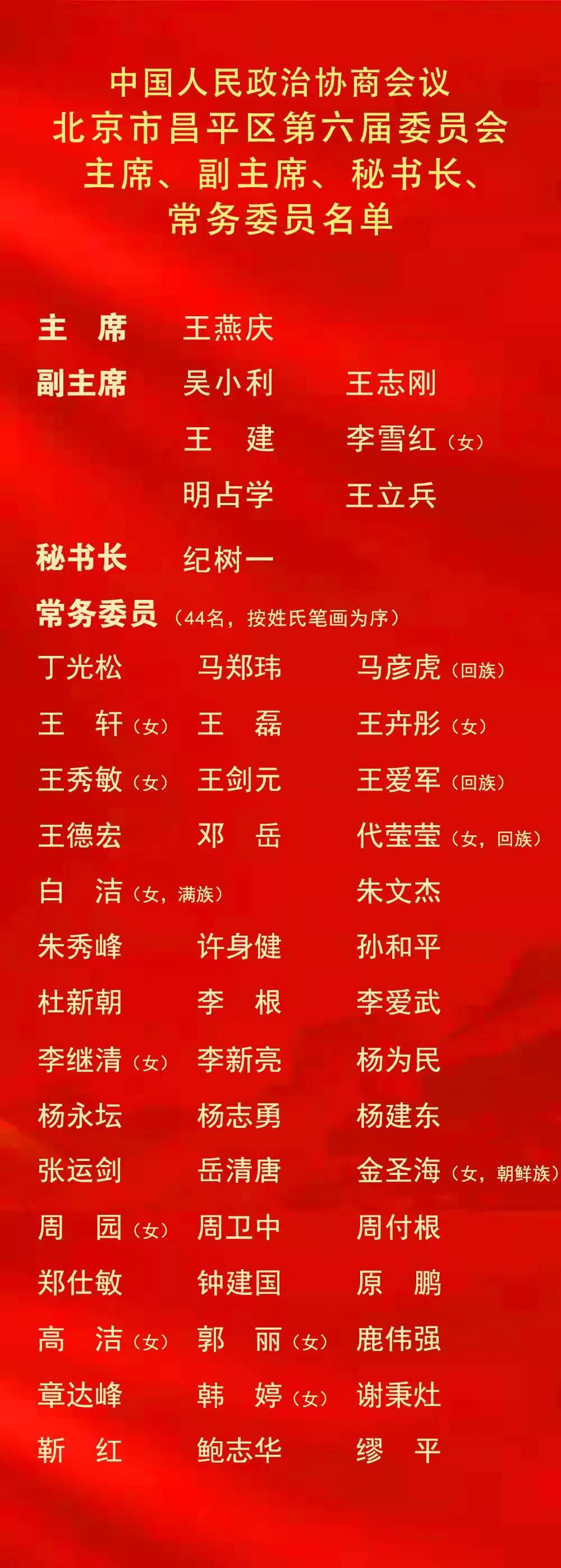 大会选举结果是,王燕庆当选为政协北京市昌平区第六届委员会主席,吴小利、王志刚、王建、李雪红、明占学、王立兵当选为政协北京市昌平区第六届委员会副主席,纪树一当选为政协北京市昌平区第六届委员会秘书长,丁光松等44位同志当选为政协北京市昌平区第六届委员会常务委员。