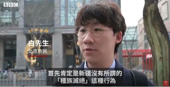 在BBC播出的这段采访视频中,外媒记者还提到了所谓的“新疆种族灭绝”。白先生说,“首先肯定的是,新疆没有所谓的 ‘种族灭绝’这种行为,反观美国才是真正灭绝了它的原住民,这才是人尽皆知的事实。”