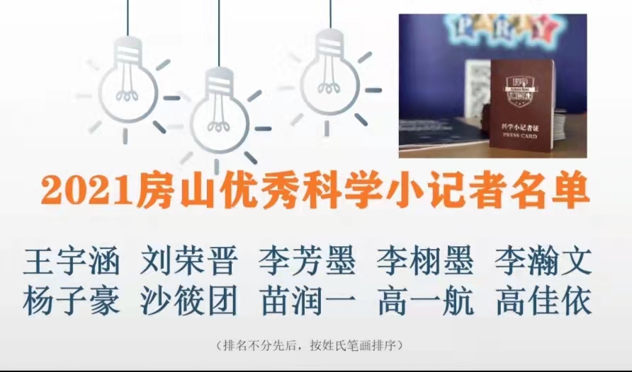 为表彰积极参与活动的科学小记者,和对他们一年以来学习成果的肯定。活动为王宇涵、刘荣晋、李芳墨、李栩墨、李瀚文、杨子豪、沙筱团、苗润一、高一航、高佳依等十名科学小记者颁发了“科学小记者证”