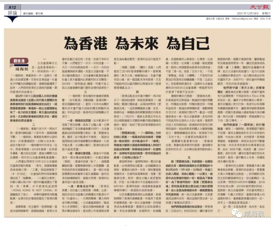 12月18日,香港《大公报》刊发“靖海侯”专栏评论文章,半个版,3000多字,剖解此事宜。全文主题,一言以蔽之,就是观照现实与未来,让中央完善香港选举制度的初心走远,使市民可以憧憬将至的美好明天。