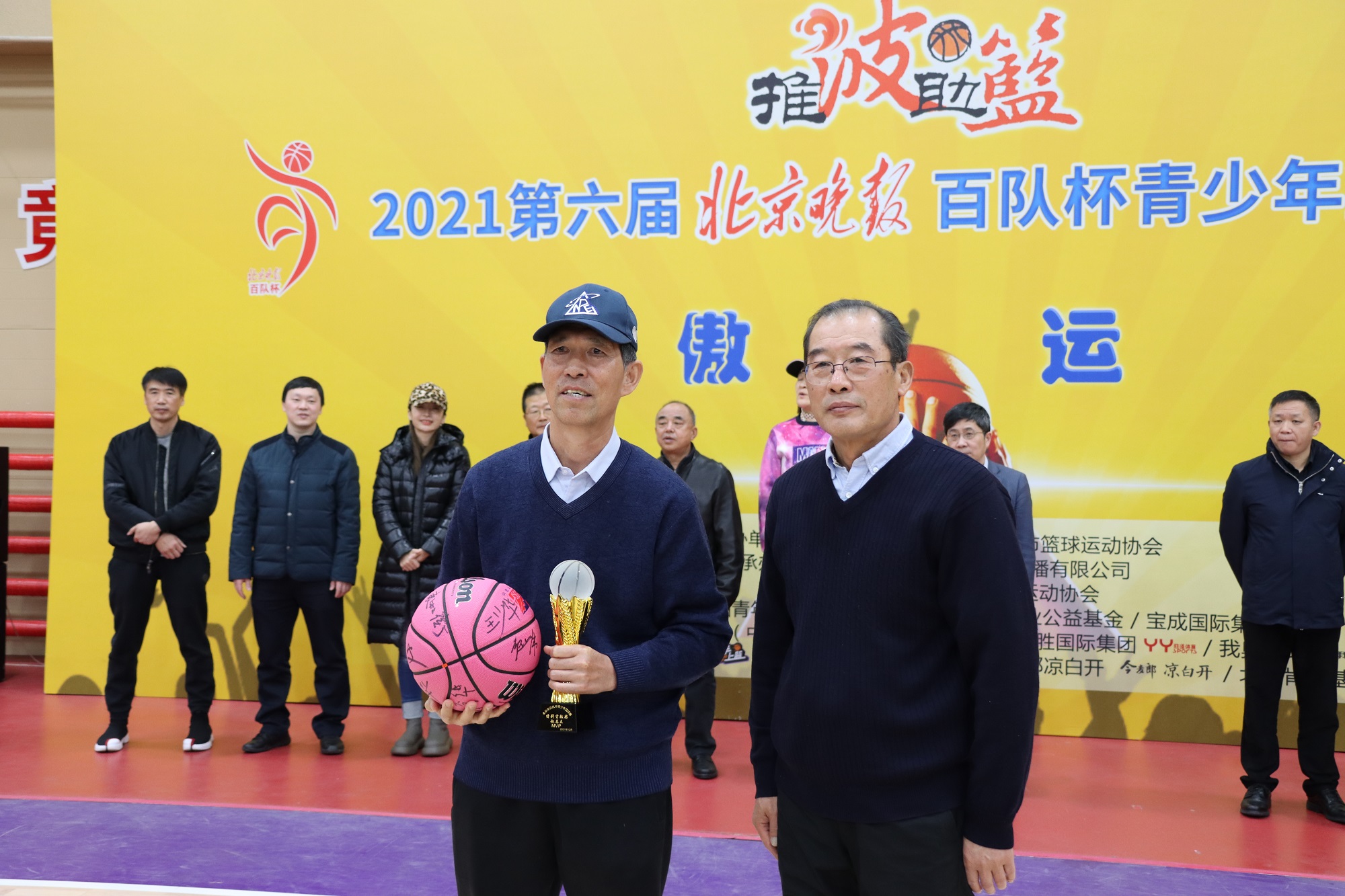经过多个比赛日争夺,2021年百队杯篮球赛落下帷幕。最终的颁奖仪式上,百队杯篮球赛组委会专门为北京市双榆树中心小学体育教师赵恩立颁发了特别贡献奖,感谢明年就将退休的他,三十余载默默致力于青少年篮球人才的培养。