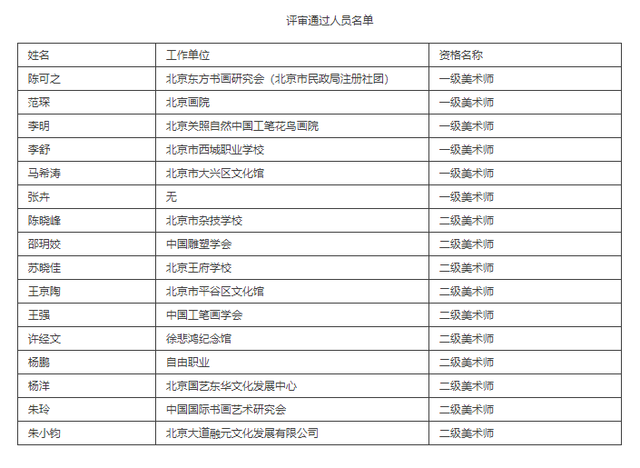 北京市艺术系列(美术)高级(正高级)专业技术资格评审委员会于2021年9月27日召开会议,陈可之等6人通过了一级美术师专业技术资格评审;陈晓峰等10人通过了二级美术师专业技术资格评审(名单附后)。根据《关于深化职称改革试行社会化职称评审的意见》(京人发〔2003〕49号)的规定,经复核,现予以公示。