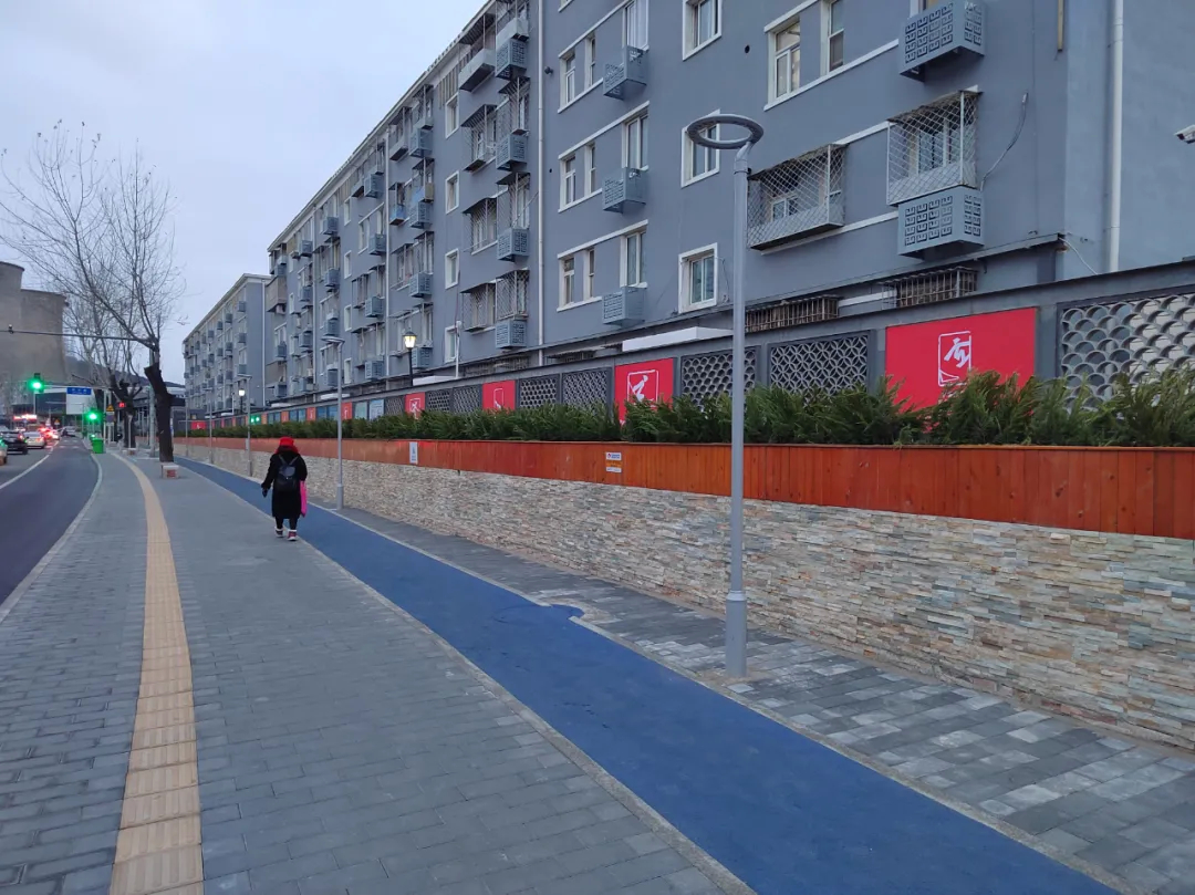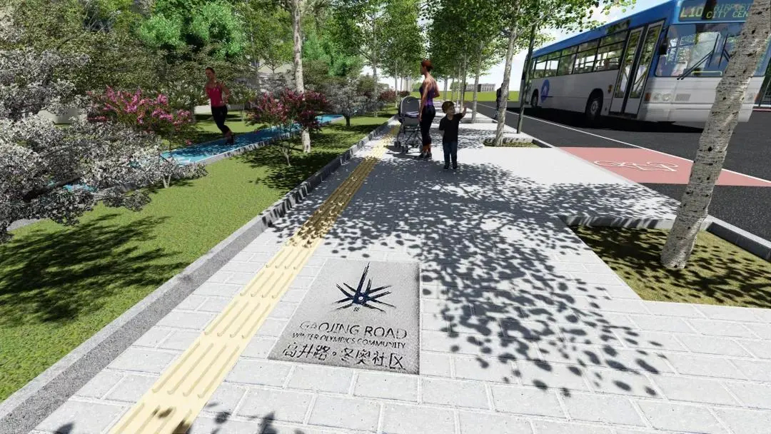 为了使高井路营造更加健康安全的道路出行环境,有效利用道路空间,结合高井沟滨河道,打造高井路冬奥社区4030米健身道,实现道路多功能出行,疏通拥堵节点,建立良好的空间秩序,提升出行幸福感。