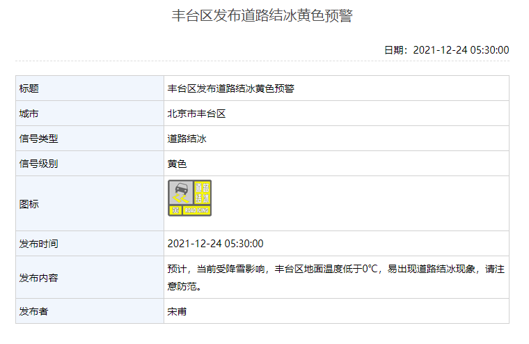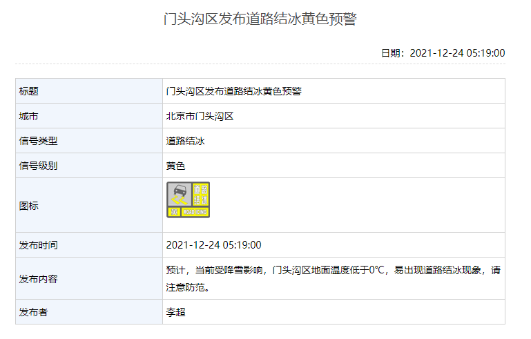 今天早上,丰台、门头沟发布道路结冰黄色预警。