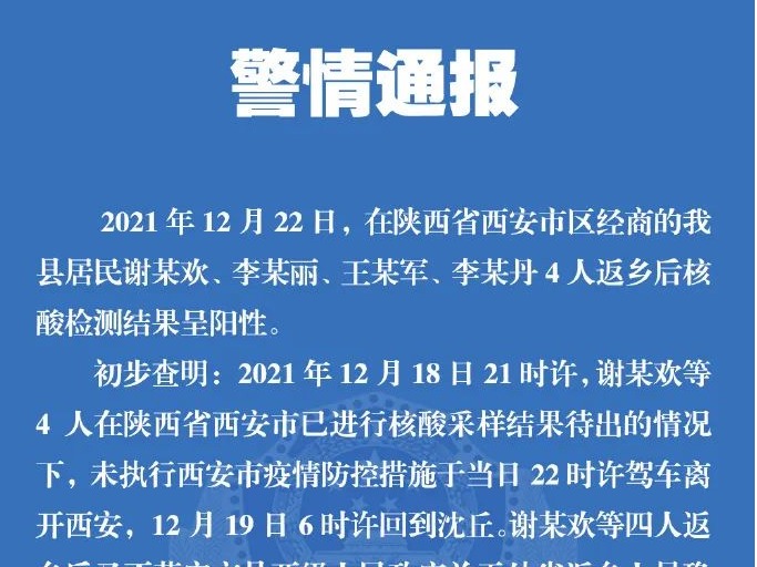 12月22日,河南省周口市沈丘县疫情防控指挥部发布通告,该县在核酸检测中发现4例阳性人员,属西安自驾返沈人员。22日晚,沈丘县公安局发布通报:决定对谢某欢等4人以涉嫌妨碍传染病防治罪立案侦查。详情>>