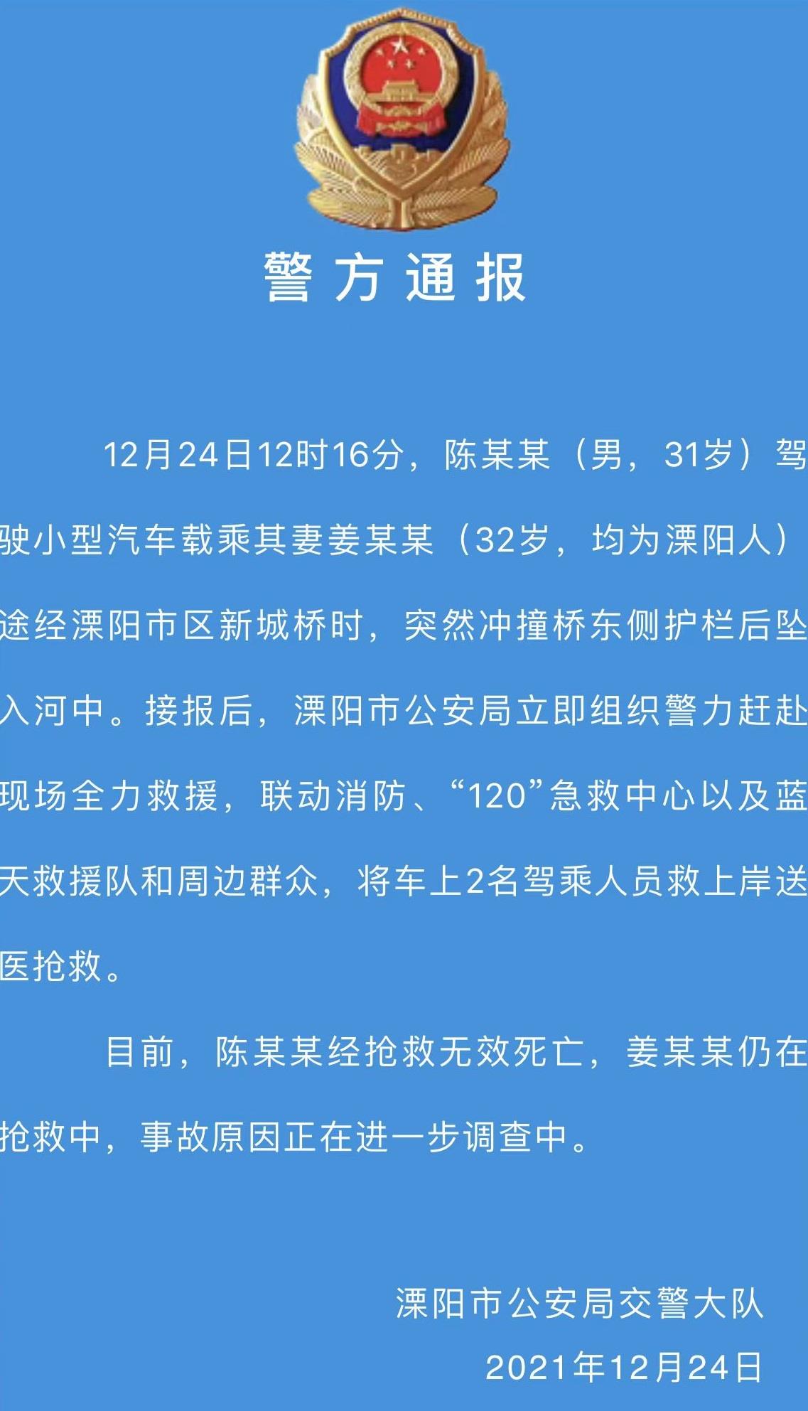 据江苏溧阳警方通报,12月24日12时16分,陈某某(男,31岁)驾驶小型汽车载乘其妻姜某某(32岁,均为溧阳人)途经溧阳市区新城桥时,突然冲撞桥东侧护栏后坠入河中。接报后,溧阳市公安局立即组织警力赶赴现场全力救援,联动消防、“120”急救中心以及蓝天救援队和周边群众,将车上2名驾乘人员救上岸送医抢救。