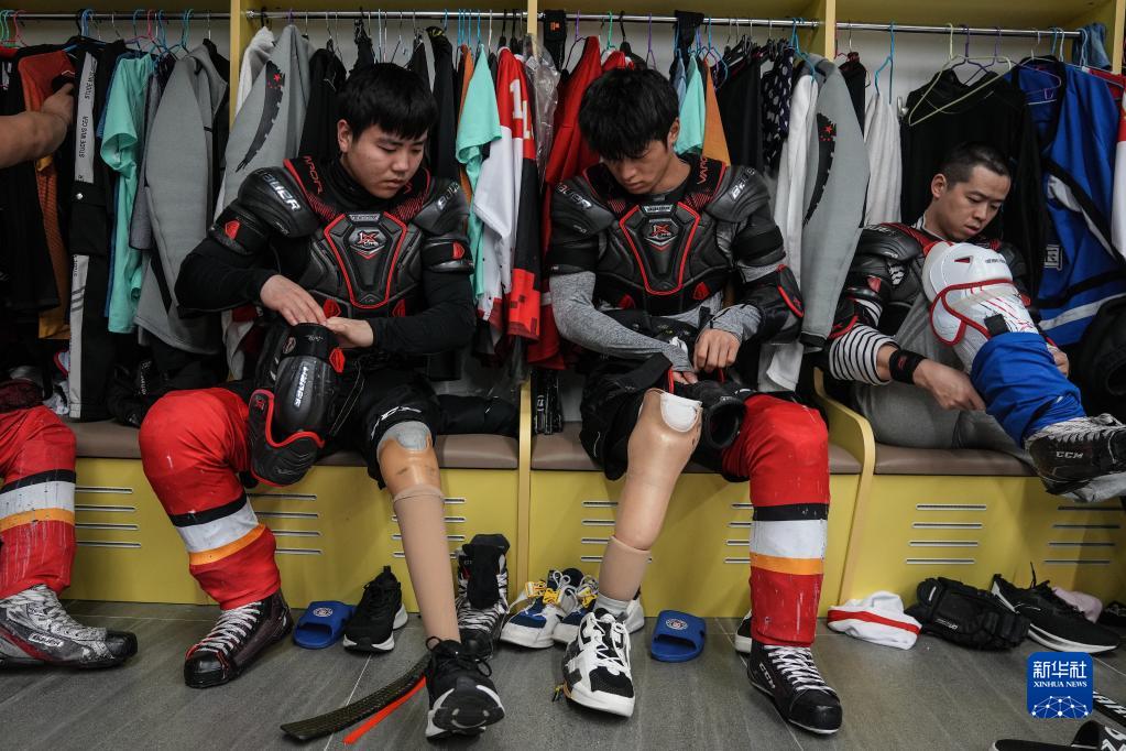 12月23日,在北京顺义中国残疾人体育运动管理中心的国家残疾人冰上运动比赛训练馆,中国残奥冰球队队员张政(中)、王聚江(左)在训练前换上装备。新华社记者 彭子洋 摄