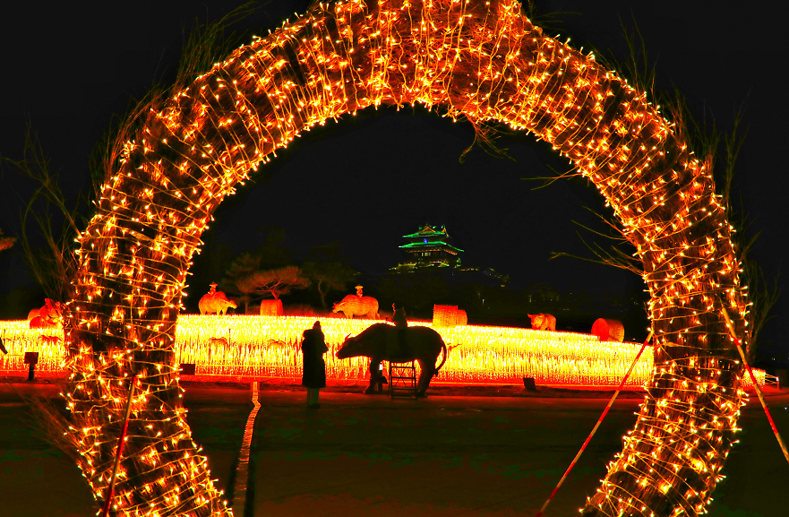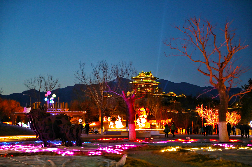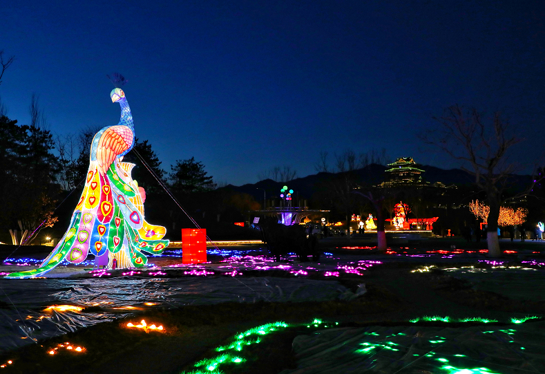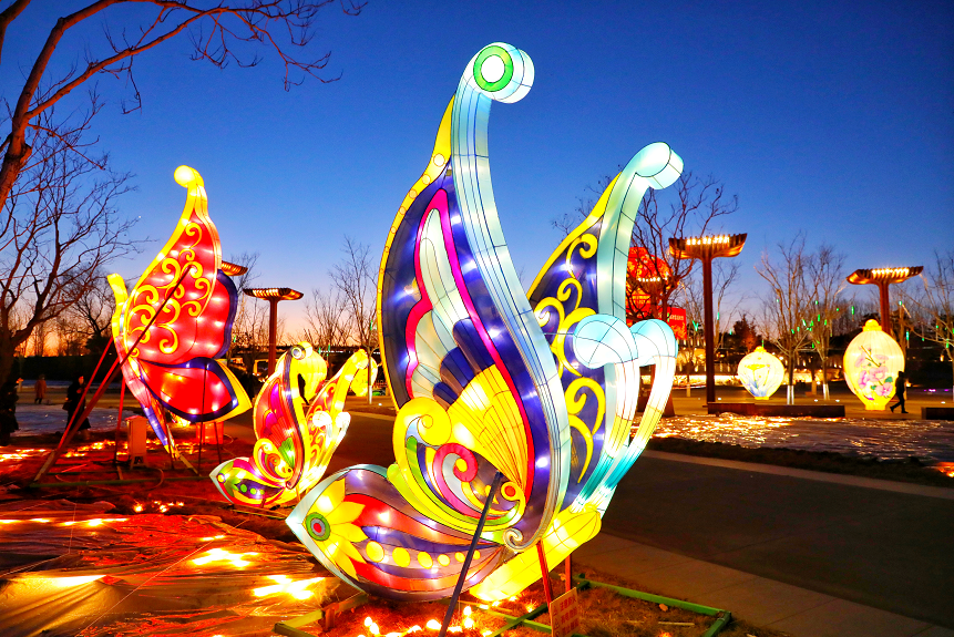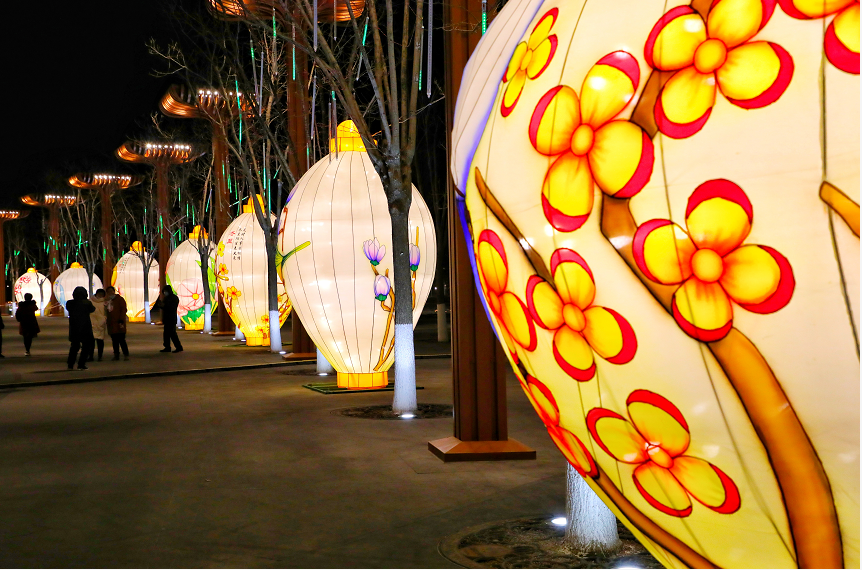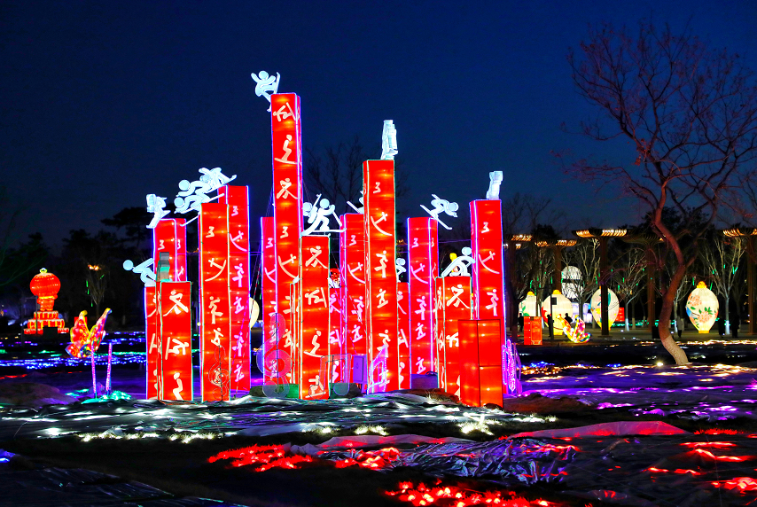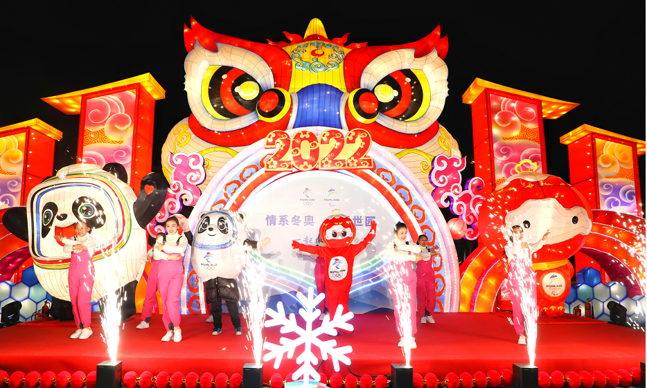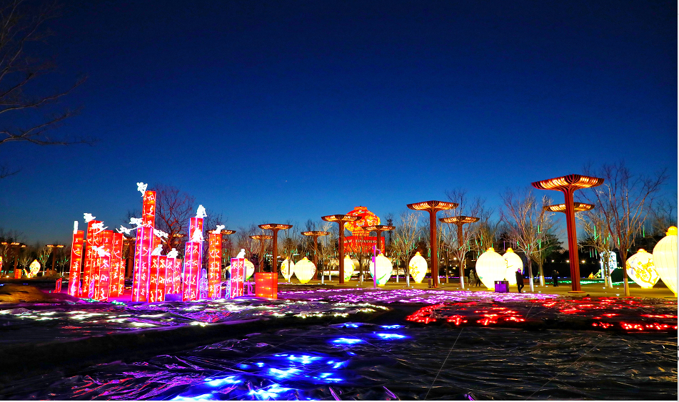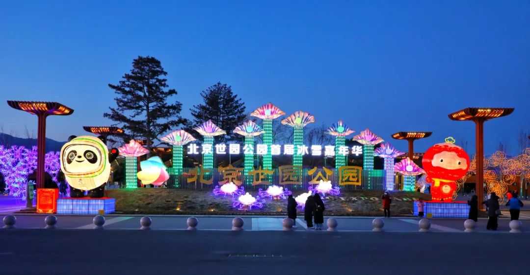 当晚,园区里39组造型花灯炫彩亮相。中国馆前中国“巨龙腾飞”“百鸟朝凤”“祥虎纳福”传统文化造型花灯独具特色,万花广场上“奥运五环”“冰墩墩 雪容融”彰显浓厚冬奥氛围,更有天田山下“黄色麦田”草雕景观华丽璀璨.....