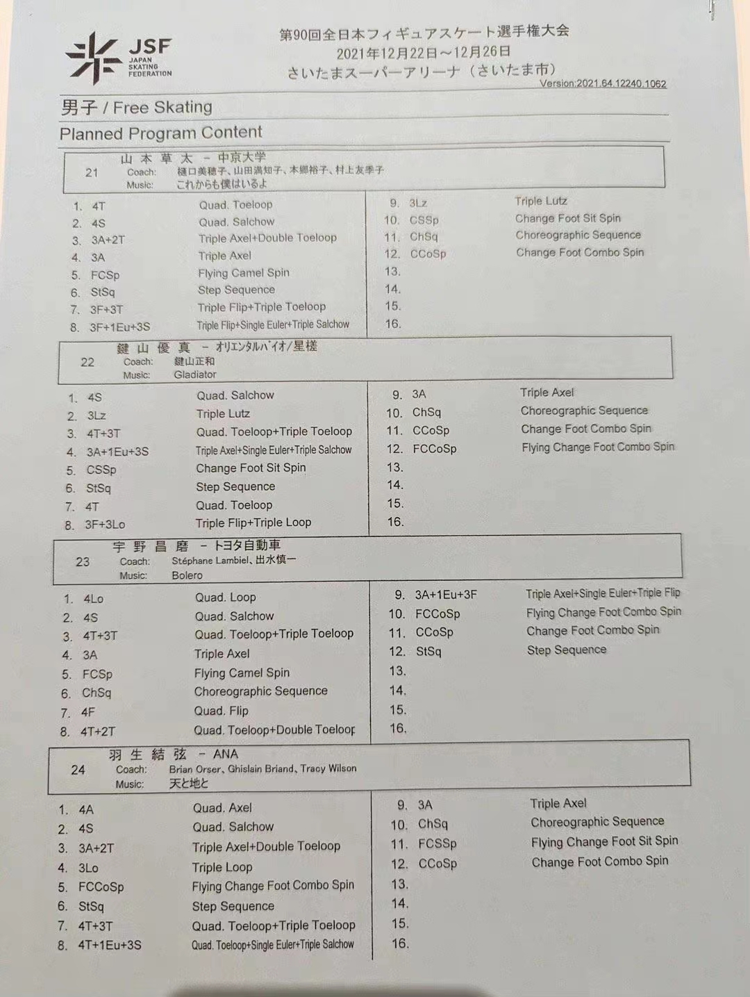 12月26日晚,全日本花样滑冰锦标赛暨北京冬奥会选拔赛在埼玉超级体育馆举行,在男子单人自由滑比赛中,羽生结弦开场既用上了阿克塞尔跳(4A)的动作。虽然最终他以双足落地完成这个动作,但是依然以自由滑211.05分,总分322.36分的成绩排名第一,顺利拿到北京冬奥会参赛资格。
