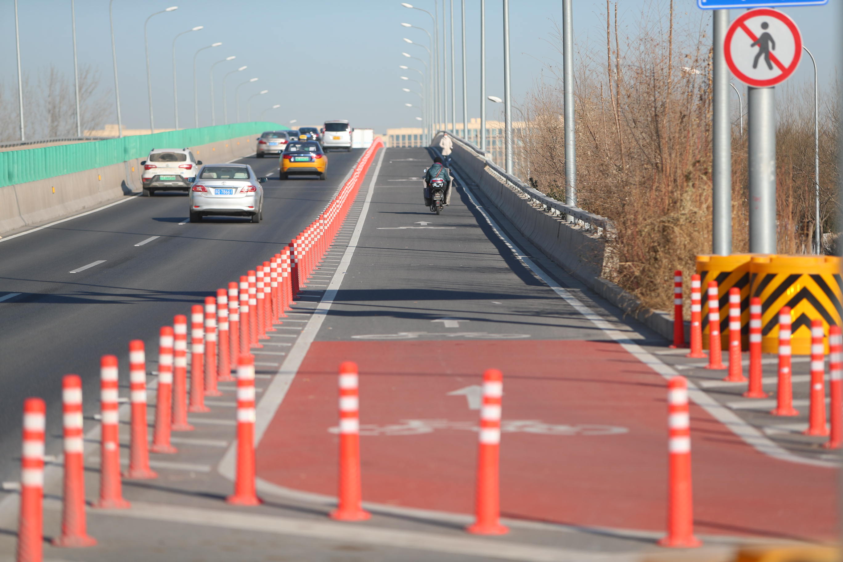为打通慢行系统“断点”,交管部门前段时间开始对跨线桥进行优化改造,将槐房西路跨线桥最外侧车道改为非机动车道,同时压缩机动车道宽度,确保非机动车道宽度达到3米以上。