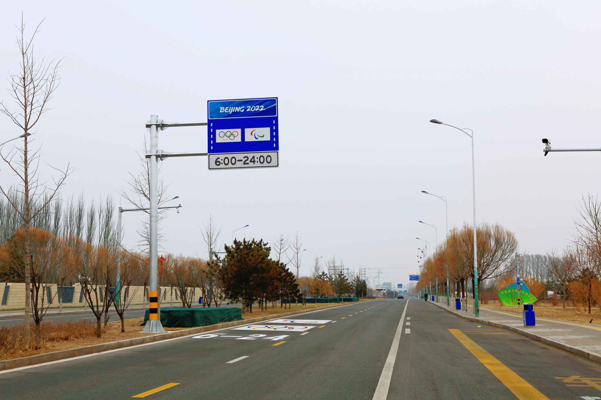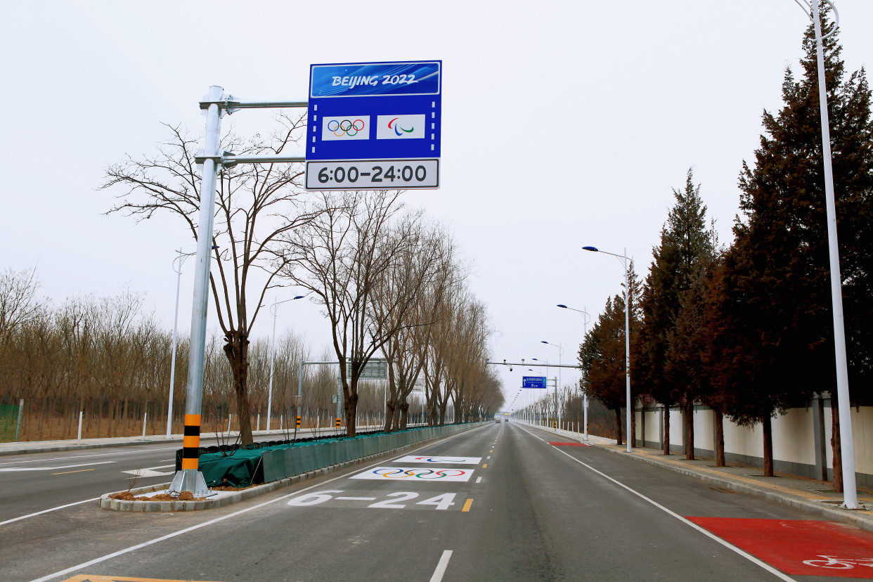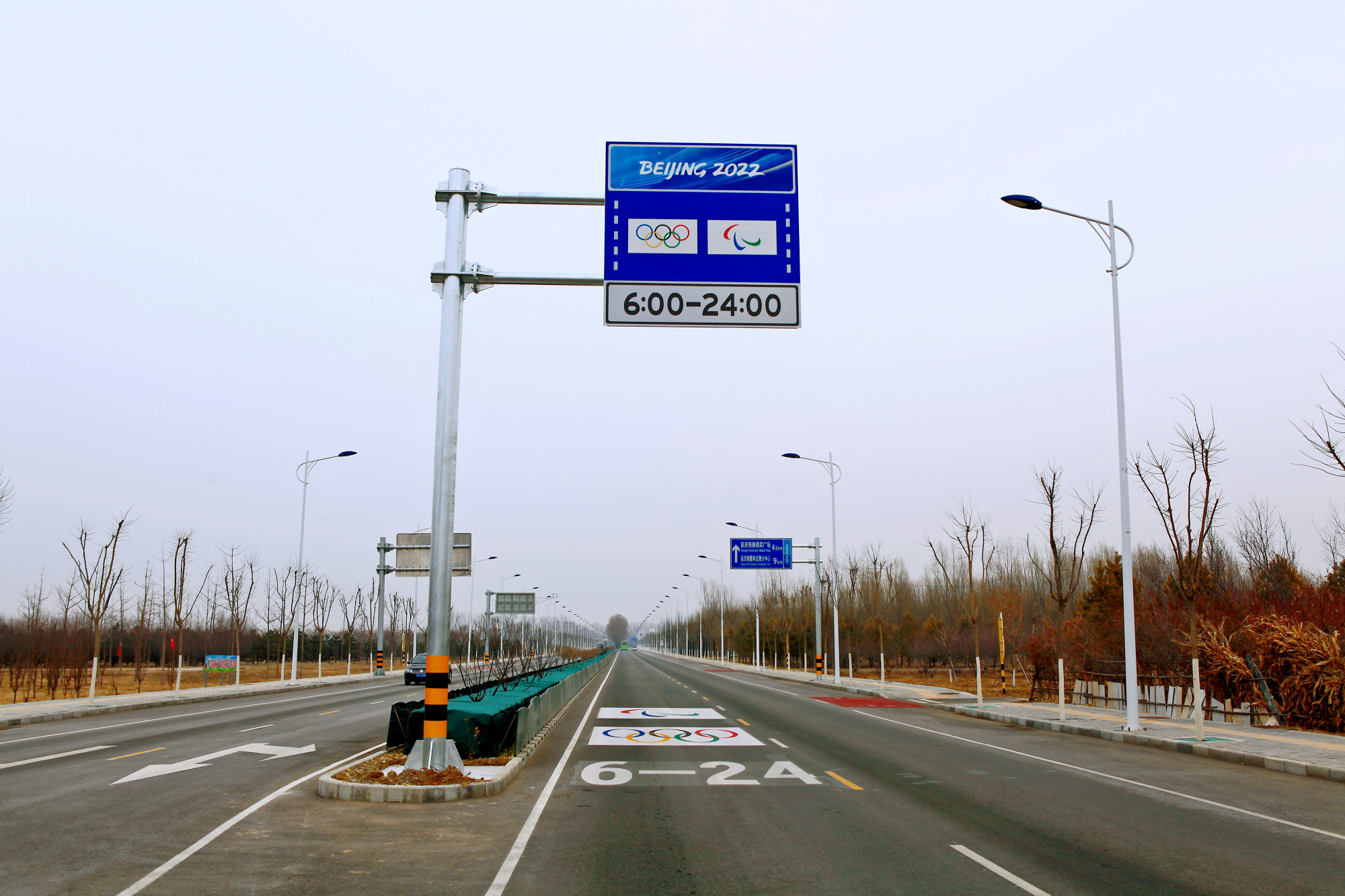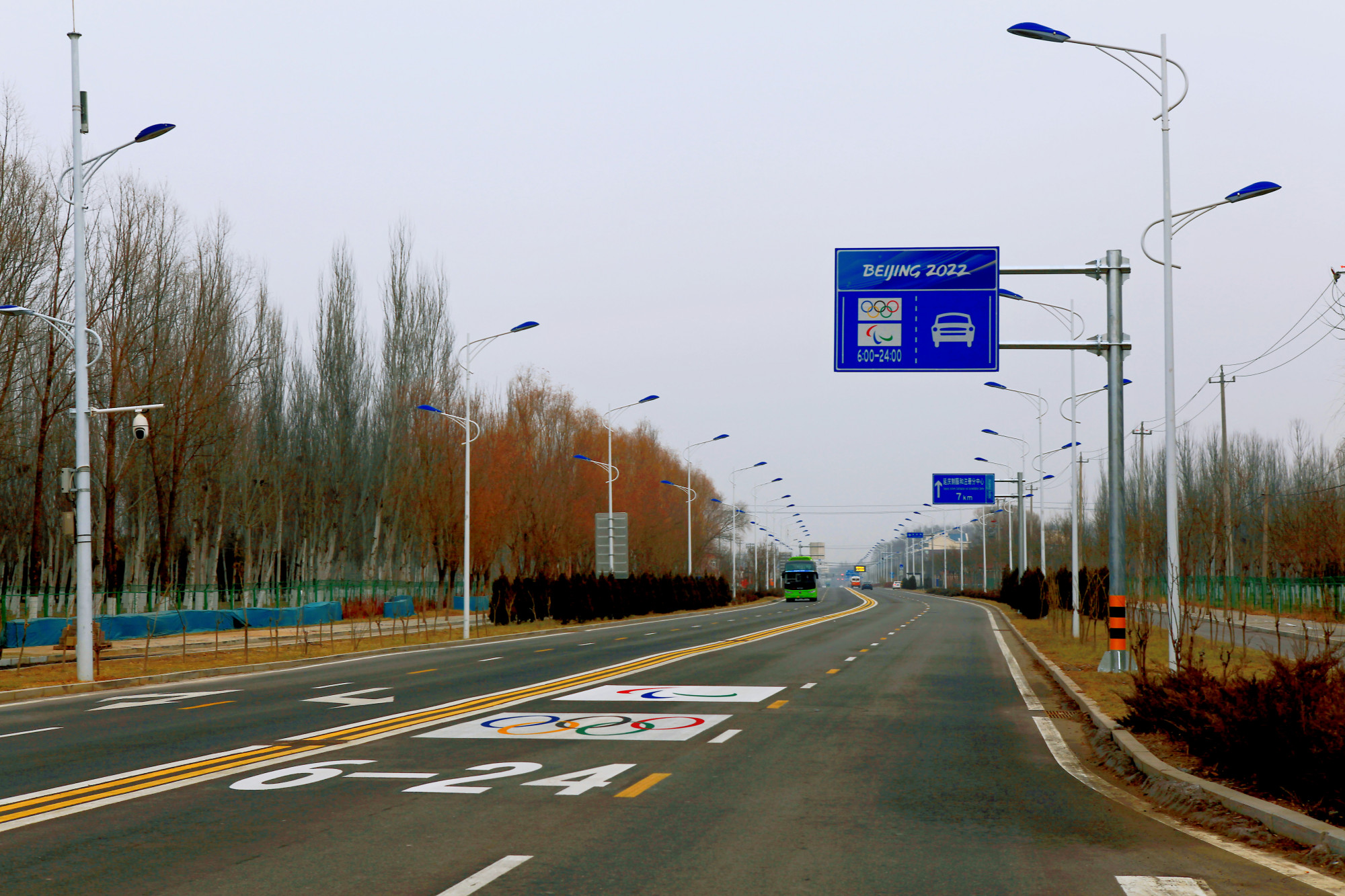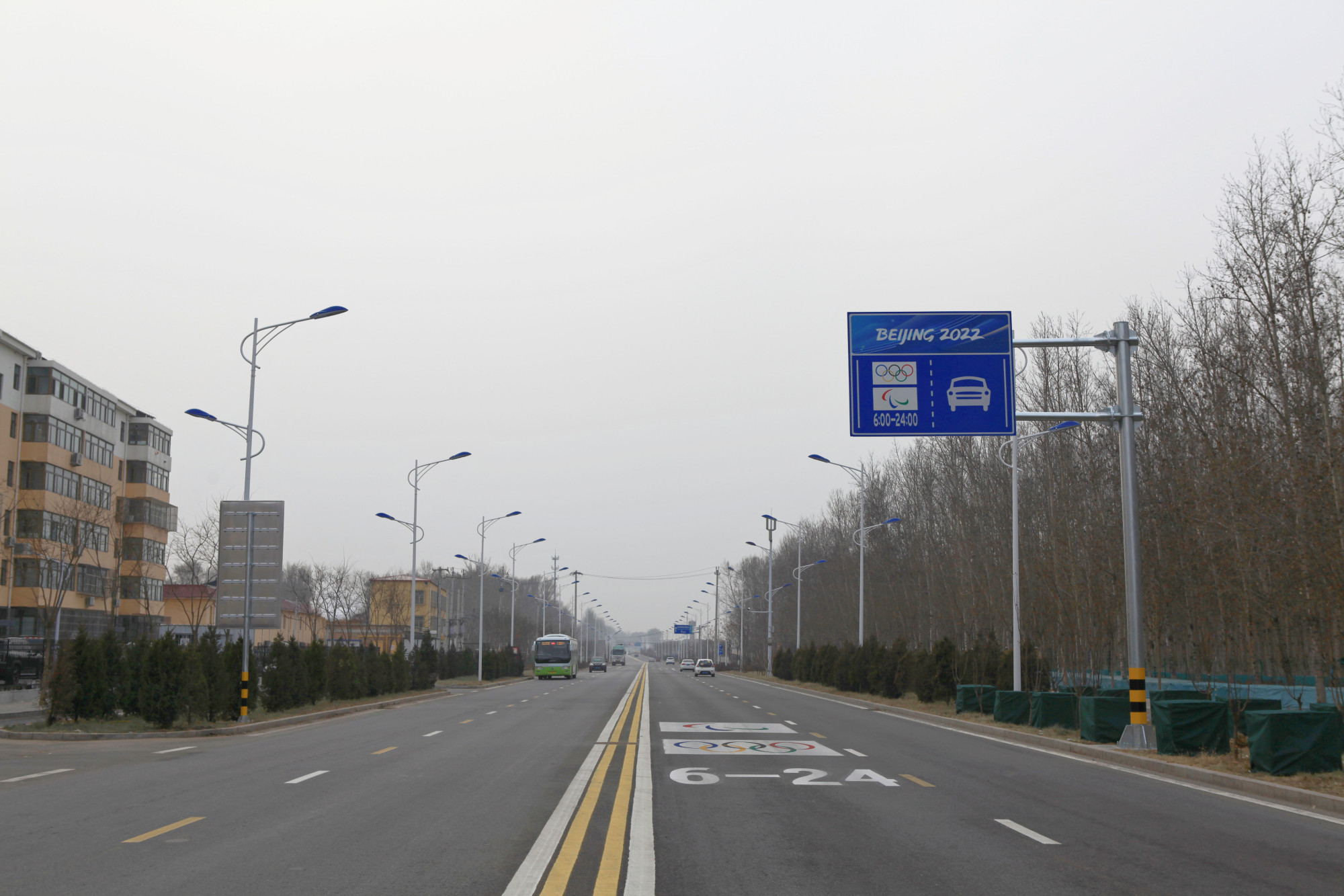 奥运专用道共涉及区域内8条普通公路,分为专用路、专用道、优先路3种类型,总里程46.143公里,专用路仅松闫路一条,专用道5条,与2条优先路相比路面多施划冬奥标识,两种道路路侧均设有冬奥标识,同时路面施划黄白虚线进行提示。