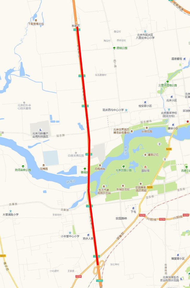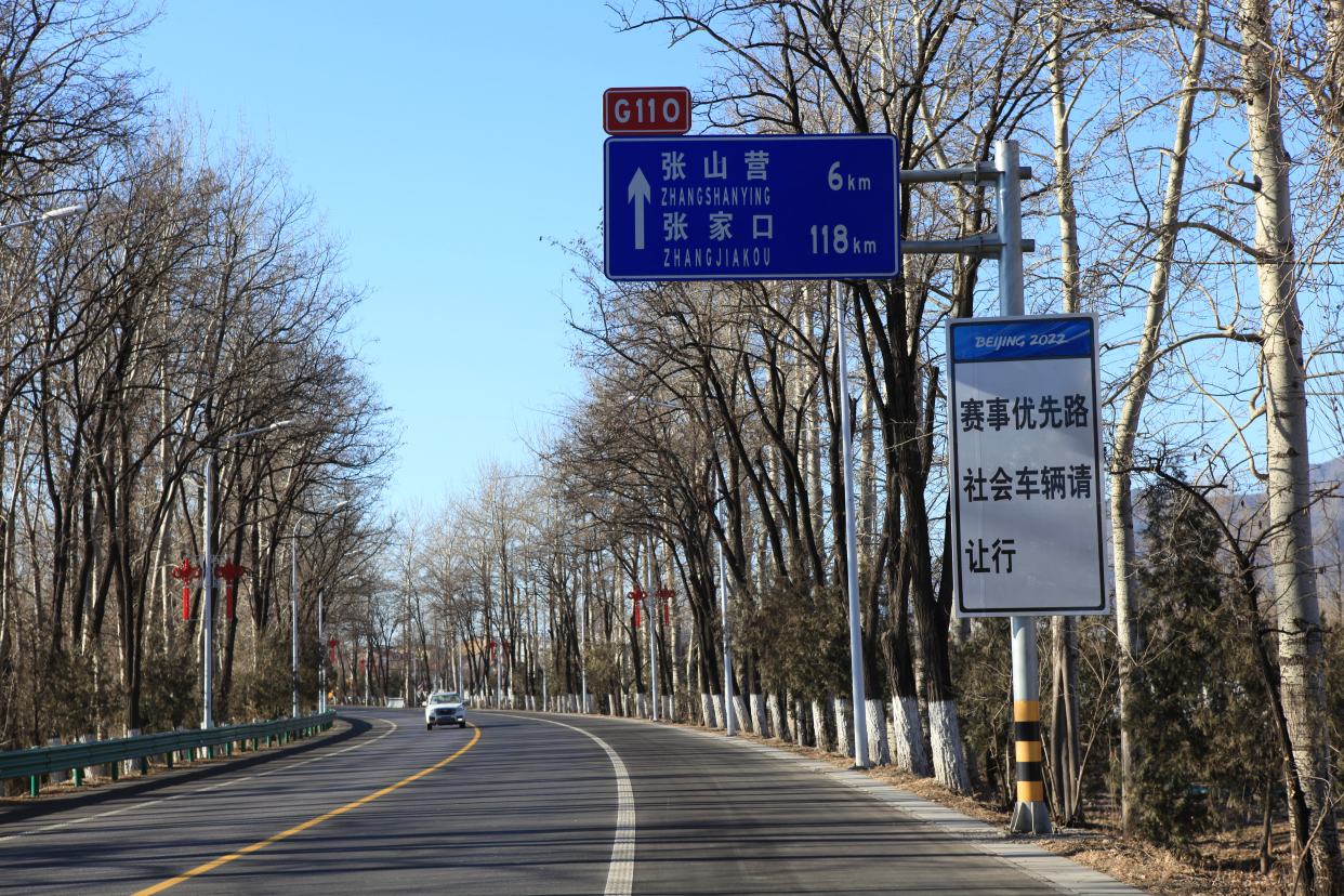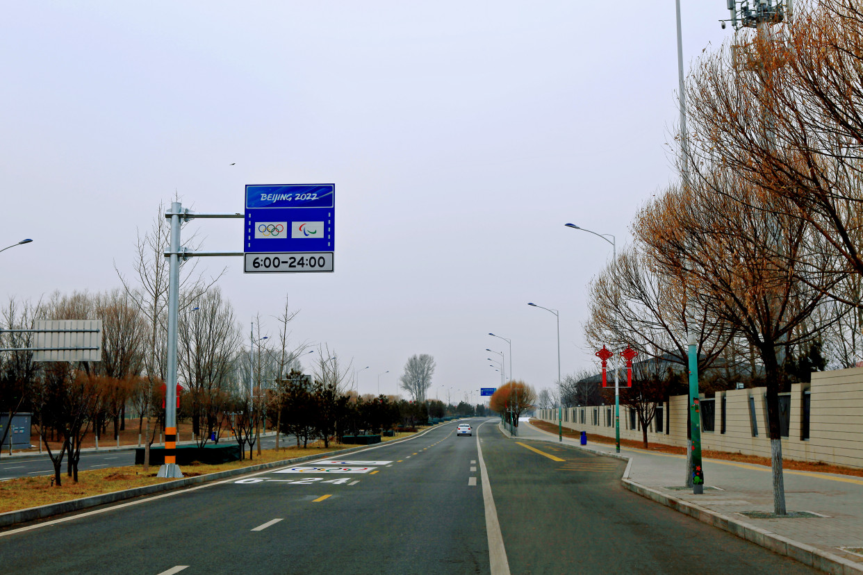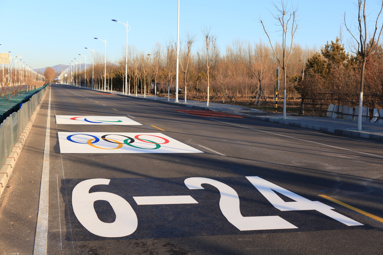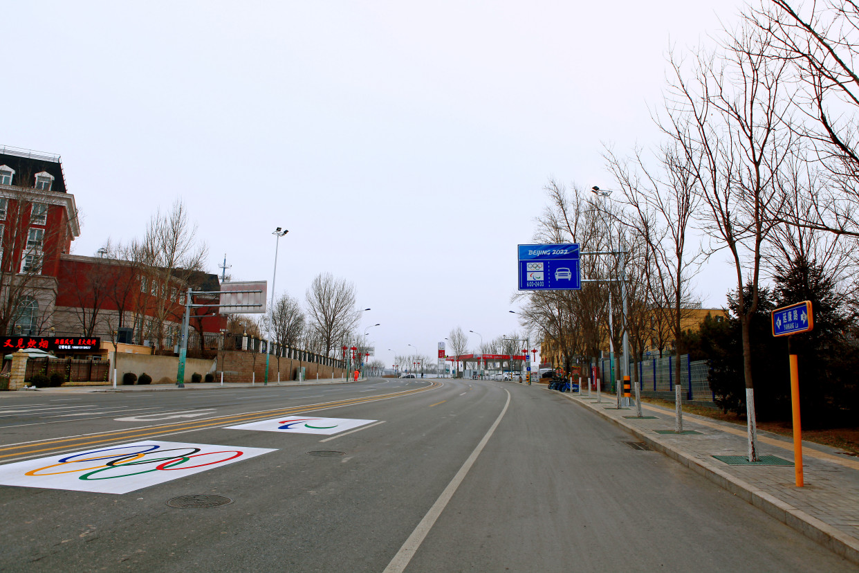 奥运专用道共涉及区域内8条普通公路,分为专用路、专用道、优先路3种类型,总里程46.143公里,专用路仅松闫路一条,专用道5条,与2条优先路相比路面多施划冬奥标识,两种道路路侧均设有冬奥标识,同时路面施划黄白虚线进行提示。