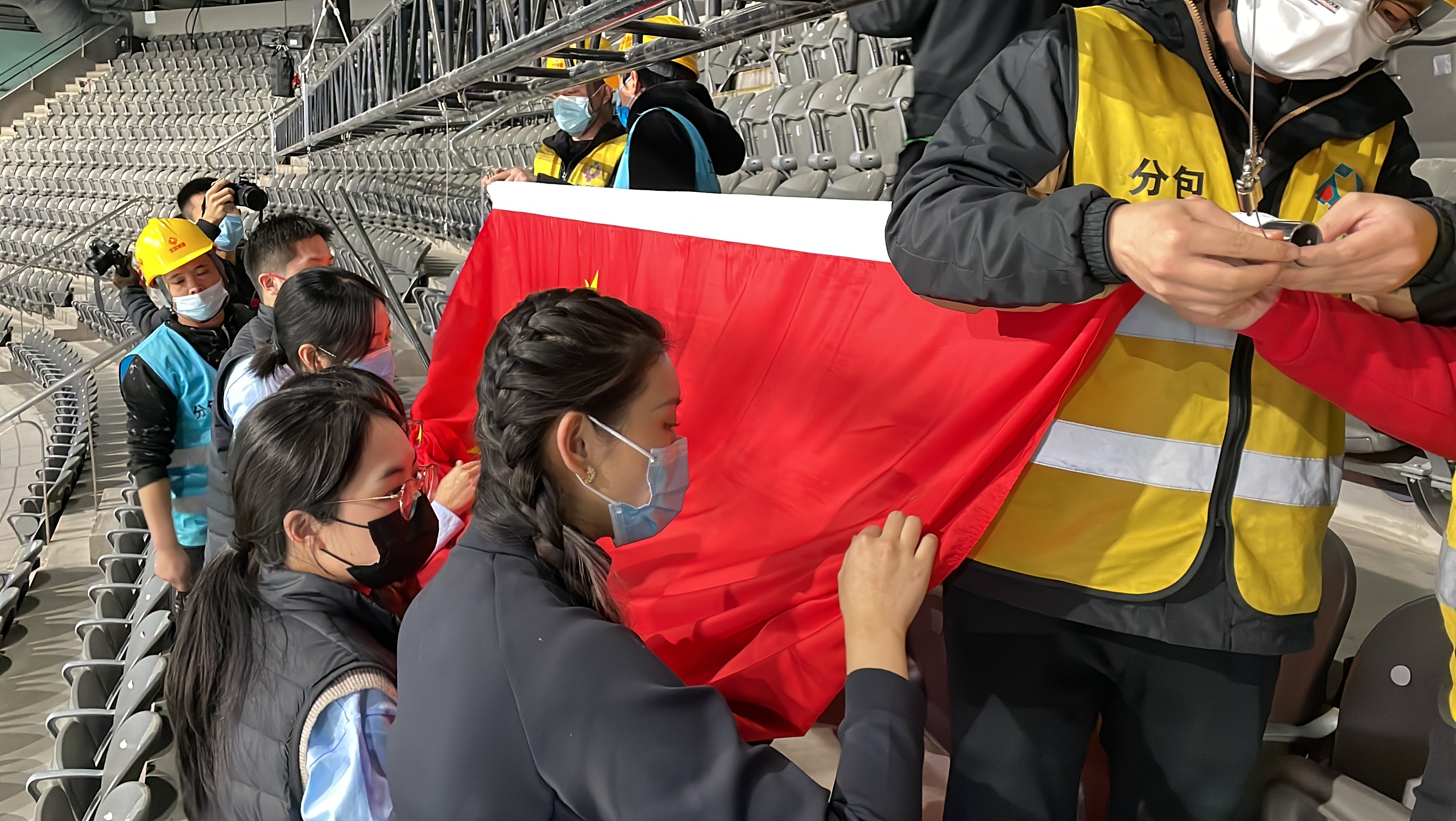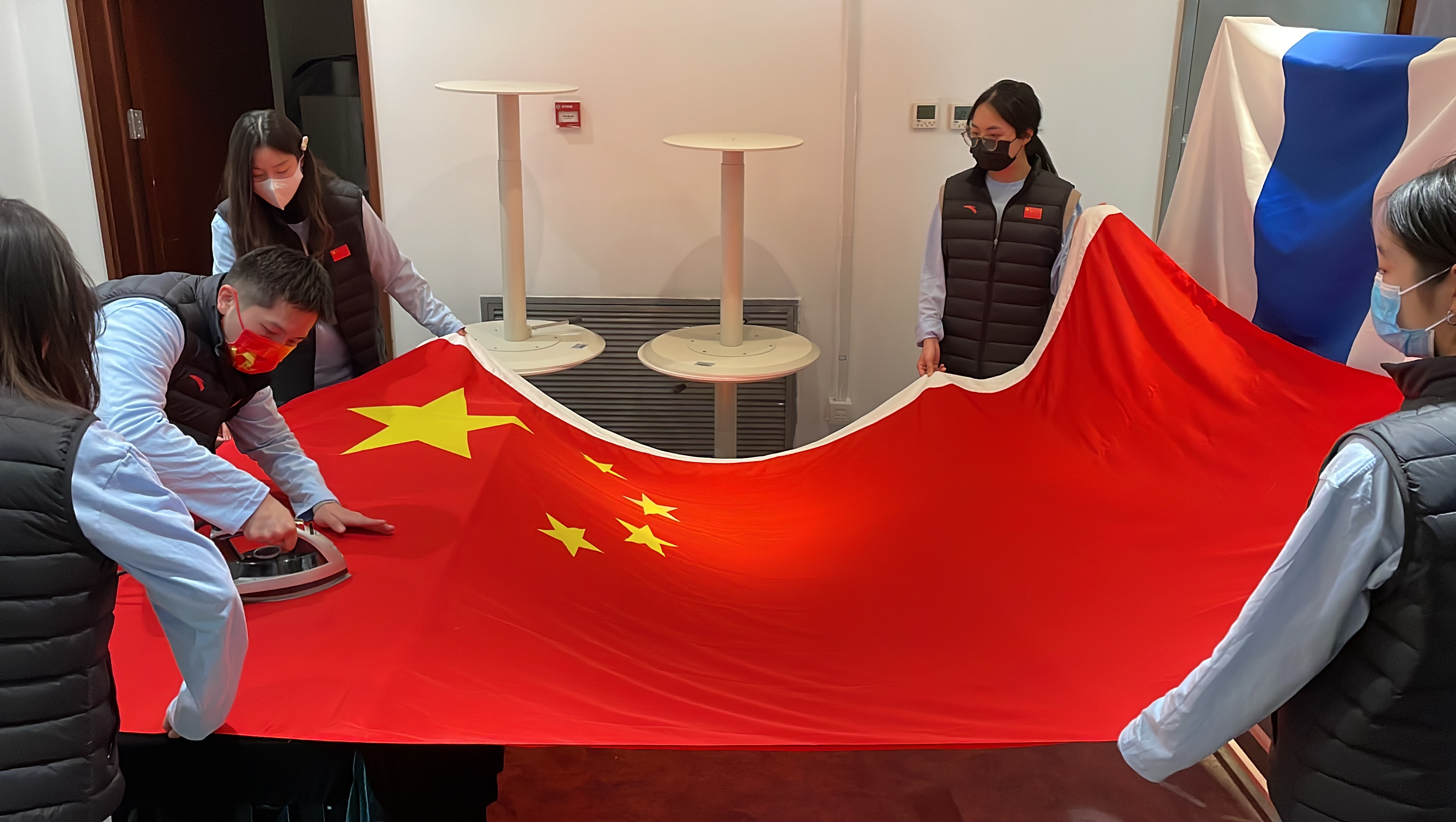 万事俱备后,悬挂之前,十几面长2.88米、宽1.92米的旗帜还需一点一点熨烫平整,平均熨烫一面旗帜就需要15分钟。来自北京语言大学研究生二年级的志愿者朱昕夫负责熨烫、运送一面五星红旗,这个23岁的小伙子以前从没熨过衣服,他弯着腰、屏住气,全程小心翼翼。国旗挂上马道后,他还捧着旗面仔细检查,清理掉因静电留在上面的头发、尘土。“希望咱们的国旗挂起来就干干净净、清清爽爽的。”小伙子说,自己是湖北咸宁人,特别感激疫情期间从全国各地赶去自己家乡助力防疫的人,“报名成为冬奥志愿者也是想为国家尽一份力,哪怕只能做一点点贡献,心里都特别骄傲。”