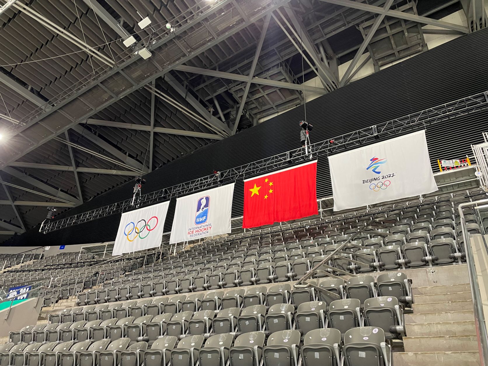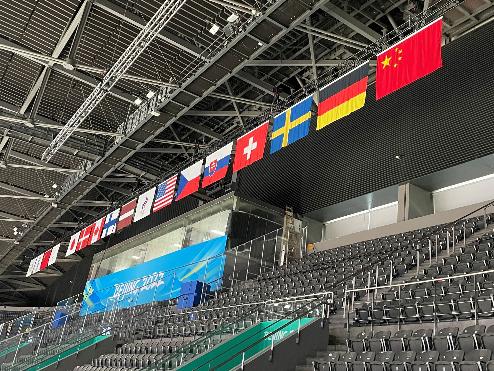 依照惯例,冬奥会比赛场馆应悬挂各参赛国家及地区旗帜,这排旗帜被称为“万国旗”,也叫静态旗帜。“万国旗”不仅能营造奥运氛围,更能激发运动员的归属感和荣誉感。北京冬奥会期间,国家体育馆承接所有男子冰球比赛和部分女子冰球比赛,总计悬挂13面参赛队伍旗帜和四面通用礼宾旗帜——国际奥委会五环旗、国际冰球联合会会旗、主办国中国国旗和北京冬奥组委会旗。
