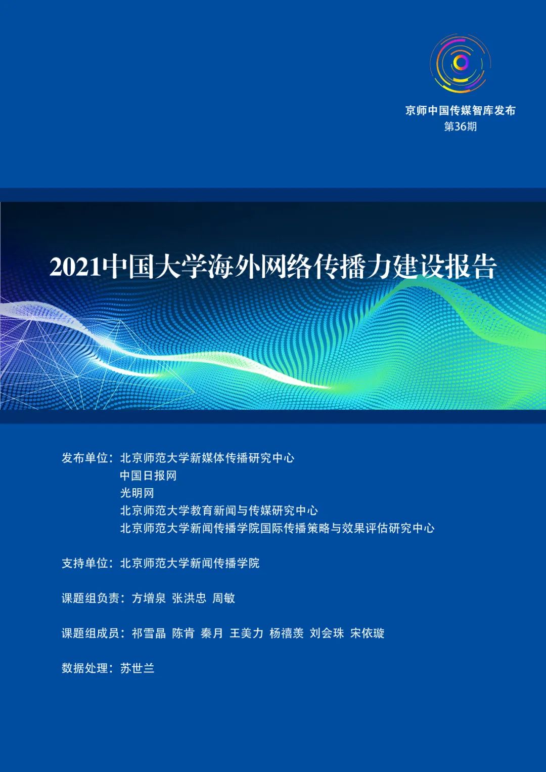 2021年12月28日,《2021中国大学海外网络传播力建设报告》(以下简称为《报告》)在北京师范大学通过线上线下结合方式成功发布。该报告由北京师范大学新媒体传播研究中心、北京师范大学教育新闻与传媒研究中心、北京师范大学新闻传播学院国际传播策略与效果评估研究中心、中国日报网以及光明网联合发布。报告会由北京师范大学新闻传播学院副院长丁汉青主持,发布专家是北京师范大学新闻传播学院党委书记方增泉。