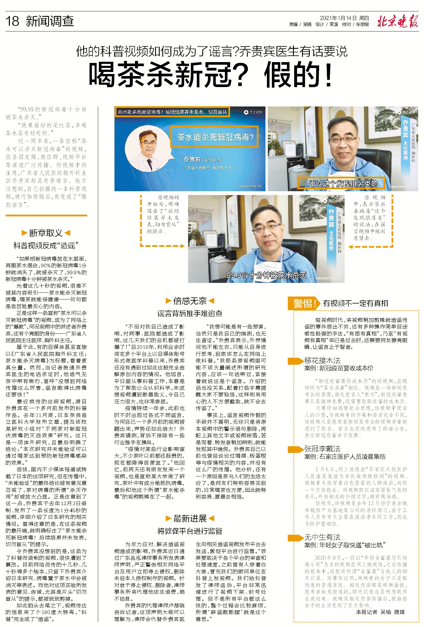 对胸外科医生乔贵宾来说,年初自己一条原本为了解释科普的视频,被自媒体剪辑拼凑、断章取义后,以“茶水能杀新冠病毒”为名大肆传播。令他直呼,“网络谣言太厉害,跑得比病毒还快!”