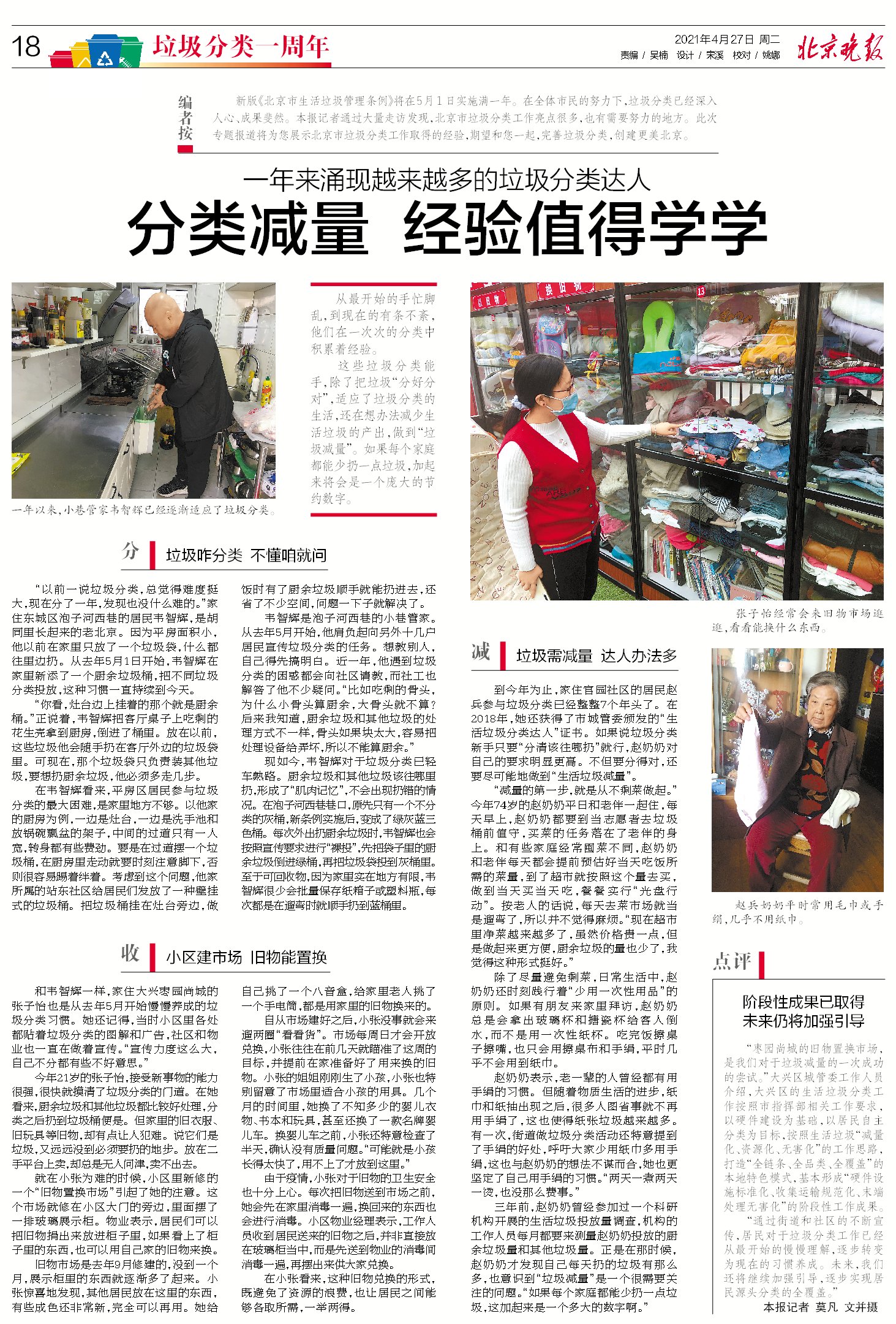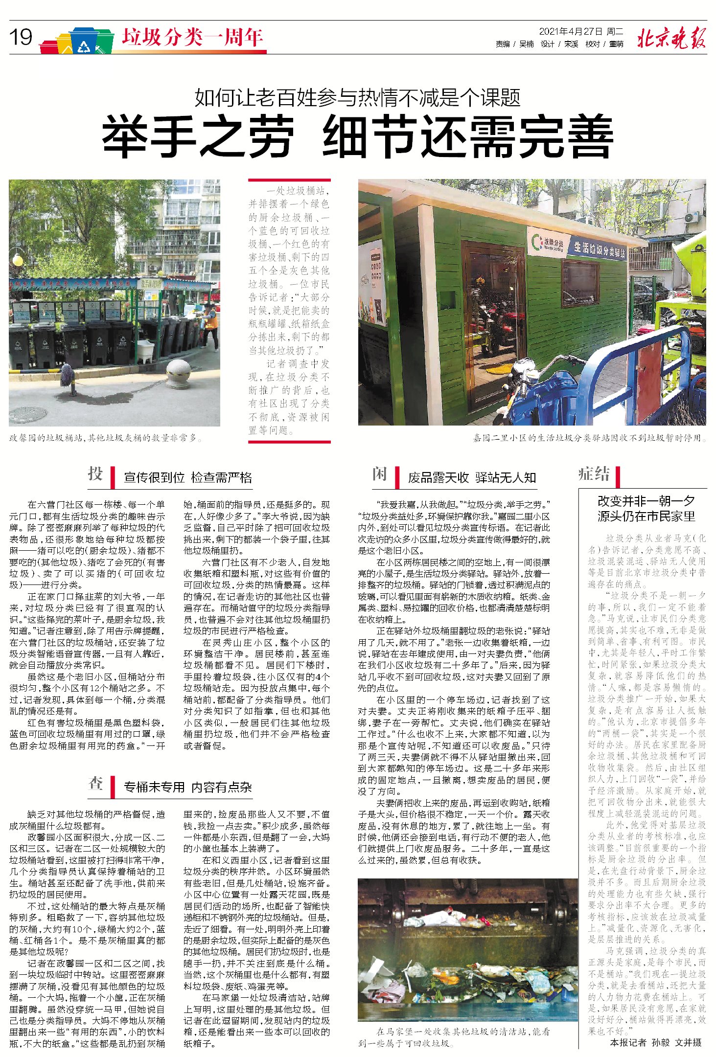 至于如何分类,吴晨也只是遵循当初学的最简单办法,把吃剩的饭菜,还有小骨头、茶叶,果皮之类放厨余,剩下都是其他垃圾。“刚开始需要反应一下该扔哪里,形成习惯后根本就不用多加思考,也不费精力。”既然这么简单,吴晨希望居民还是要多参与一些,不要把之前好不容易得到的成果丢掉了。