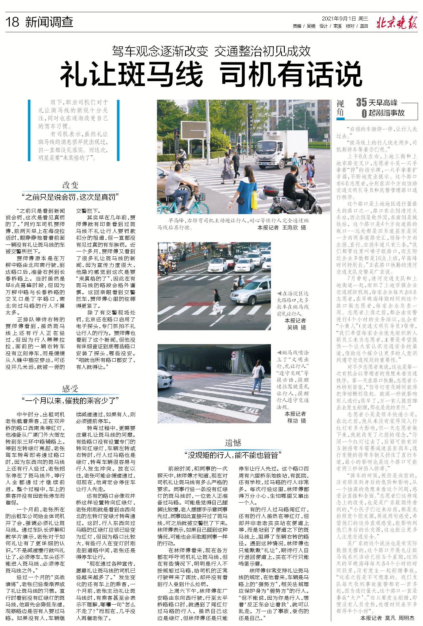 从“不敢迈步”到“变化真大”,今年,北京在全市推行“礼让斑马线”行动。多条路面新铺斑马线、增设红绿灯和“礼让行人”文字提醒、路口文明交通劝导员多了起来……随着软硬件不断完善,不少令人“头疼”的过街点位,通行环境有了提升。