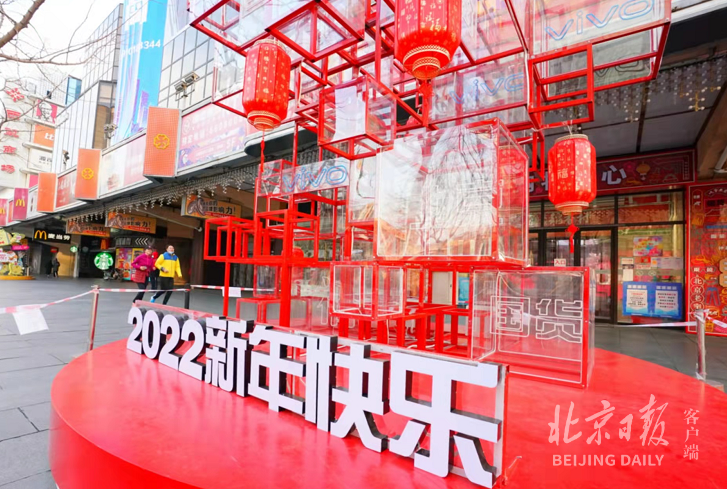 2022年新年第一天,在西单商圈,富含冰雪元素、中国传统文化韵味和卡通动漫形象的多种迎新年景观装置点缀街头,为京城增添浓浓的新年气氛。
