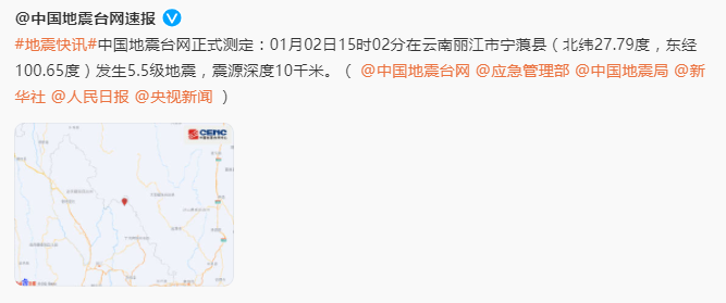 据中国地震台网正式测定:1月2日15时2分在云南丽江市宁蒗县(北纬27.79度,东经100.65度)发生5.5级地震,震源深度10千米。