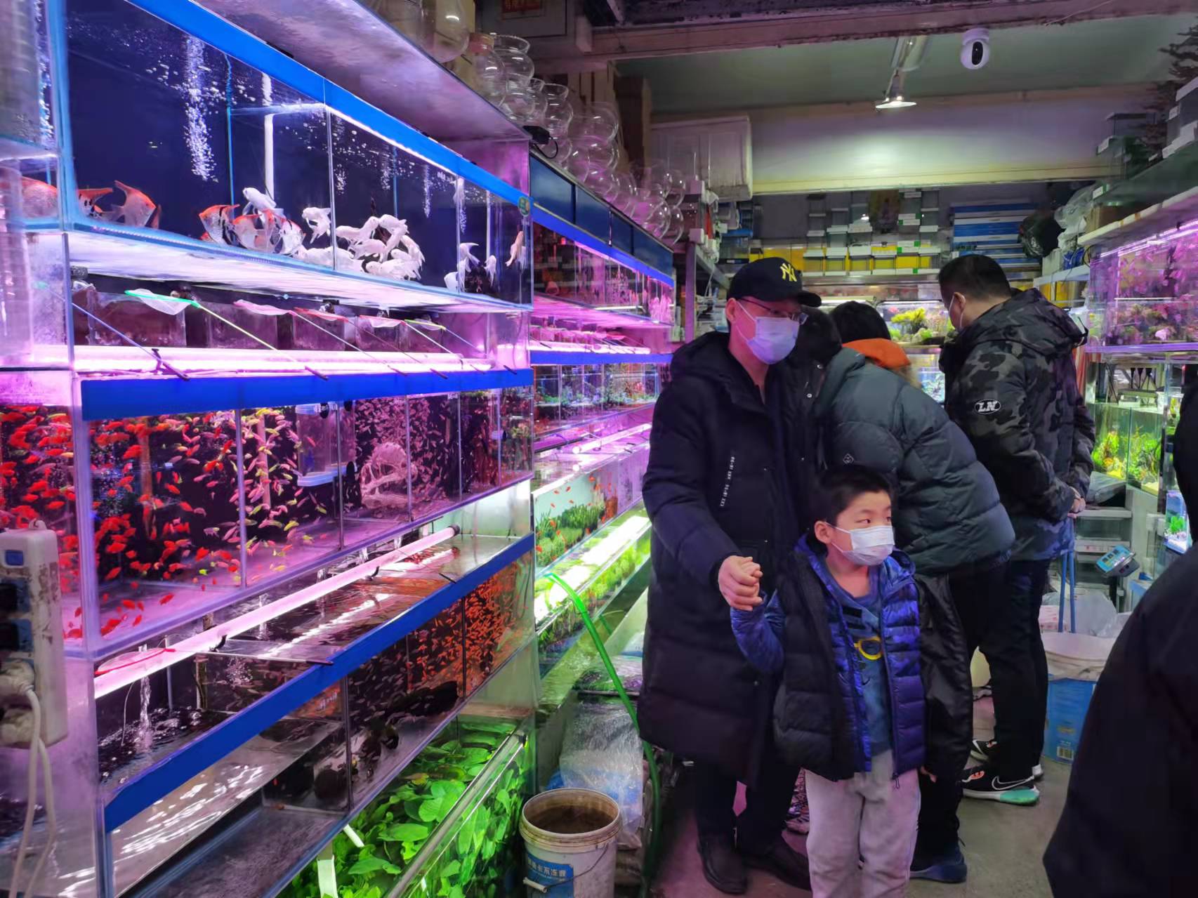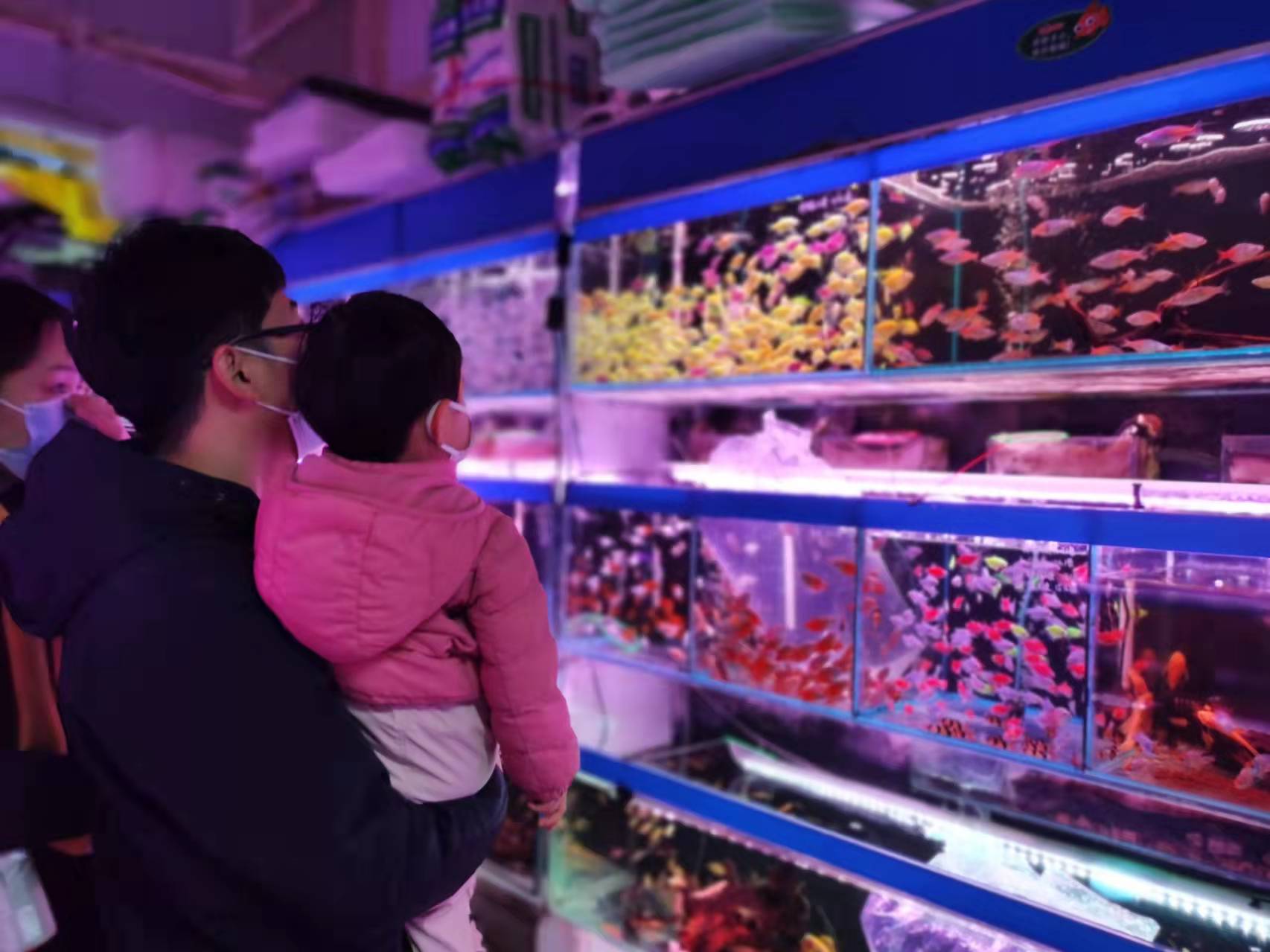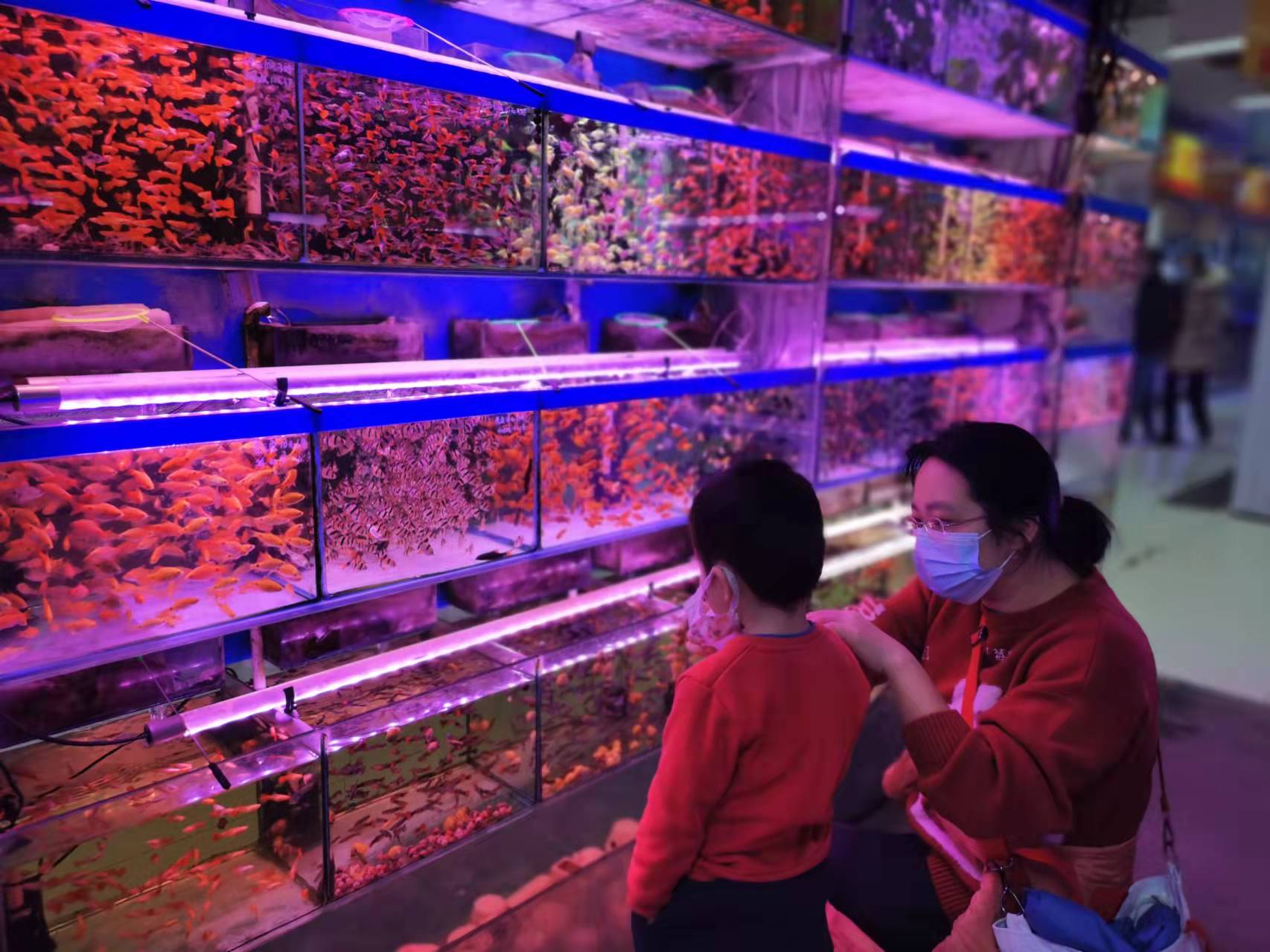 “这条红绿灯怎么样啊?10块钱6条。”马女士举着手机,与女儿视频挑选孩子喜欢的年宵观赏小鱼。元旦小长假最后一天,昌平区三旗百汇花鸟鱼虫市场人头攒动,像马女士一样来此选购年宵鱼的市民络绎不绝,节日气氛浓郁。