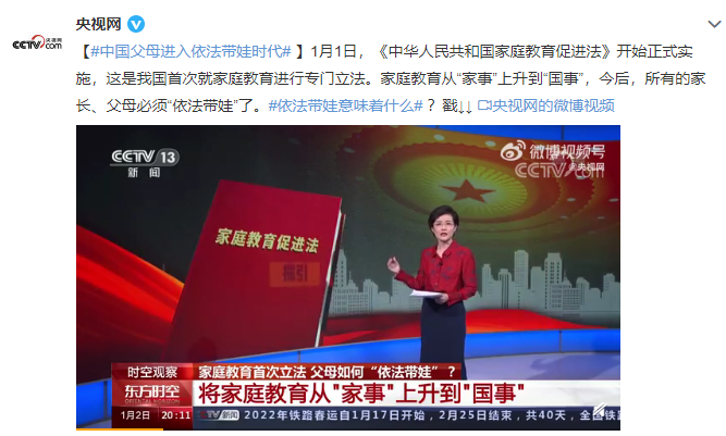 1月1日,《中华人民共和国家庭教育促进法》开始正式实施,这是我国首次就家庭教育进行专门立法。家庭教育从“家事”上升到“国事”,今后,所有的家长、父母必须“依法带娃”了。