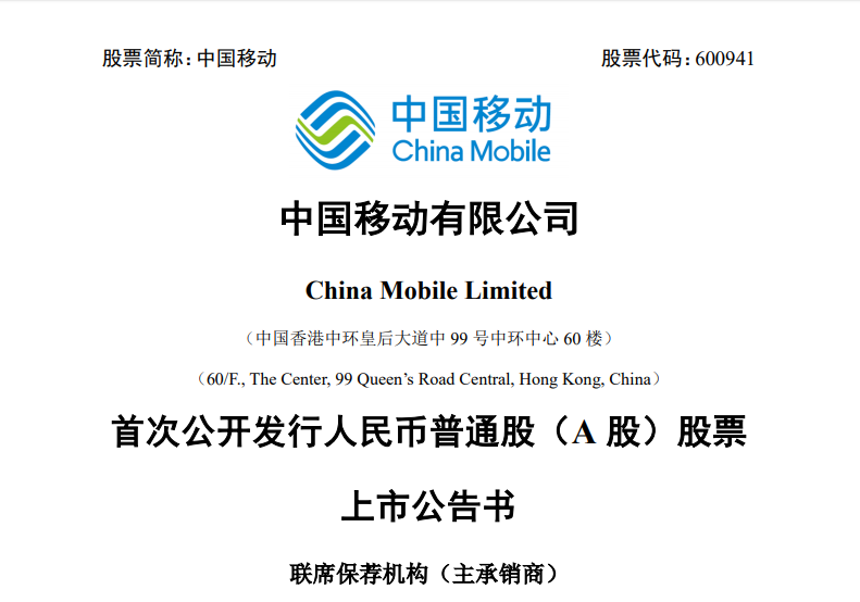 公告称,中国移动A股股票上市已经上海证券交易所“自律监管决定书〔2022〕1号”批准。公司发行的 A 股股票在上海证券交易所上市,证券简称“中国移动”,证券代码 “600941”。