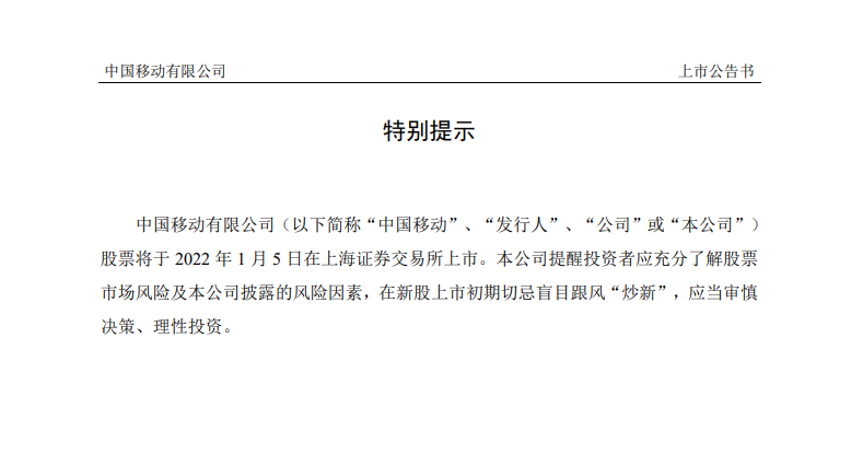 1月3日,中国移动发布的首次公开发行人民币普通股(A股)股票 上市公告书显示,公司A股股票将于2022年1月5日在上交所上市。