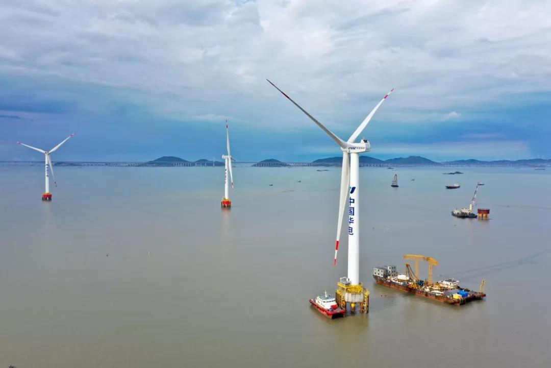 ▲华电福清海坛海峡海上风电项目首台海上风电主控系统国产化机组(右)。(新华社记者 姜克红/摄)