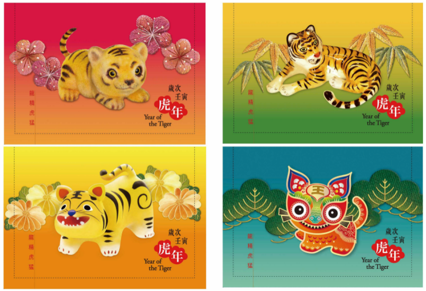 据香港特区政府新闻公报,香港邮政1月4日公布,将在1月18日以“岁次壬寅(虎年)”为题发行贺岁生肖邮票。一套四枚邮票及邮票小型张,均以老虎造型的工艺品为设计图案。另推出“心思心意邮票”小版张及丝绸邮票小型张和以“健牛福虎”为题的十二生肖金银邮票小型张,齐以福虎贺岁,为新春佳节增添喜庆。