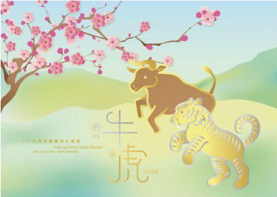 至于题为“健牛福虎”的十二生肖金银邮票小型张,则以中国画风的山河为背景,缀以点点花开,喜迎新岁。金银邮票上的健牛与福虎配对成双,分别以银箔和金片制作,熠熠生辉,尽显气派。健牛勤奋强壮,福虎活泼好动,一同祝愿大众来年龙精虎猛、身壮力健。
