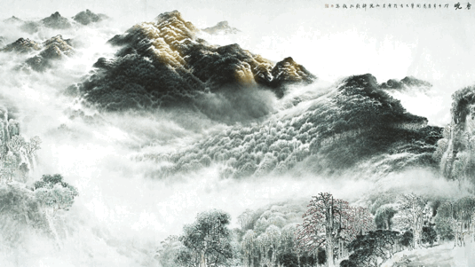 画面以留白为主,虽未过多晕染曙光,却使人能够从主峰的侧峦中感受到晨光中的朝霞。