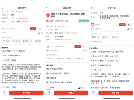 记者打开“螃蟹通告”发现,在“探店”招募信息中,不乏大量线下医美机构的招募信息,发布机构遍布全国各地,费用有低至百元的“稿费”也有高至万元的医美项目体验置换。这些招募信息对素人要求的门槛也不一样,有的招募“500粉丝以上均可参加”,有的则要求本人出镜且需授权肖像使用权。相比部分消费品牌把小红书当成违规营销的主阵地,这些线下医美机构,一般会要求接单素人在小红书、抖音、微博和大众点评等多平台进行发布。