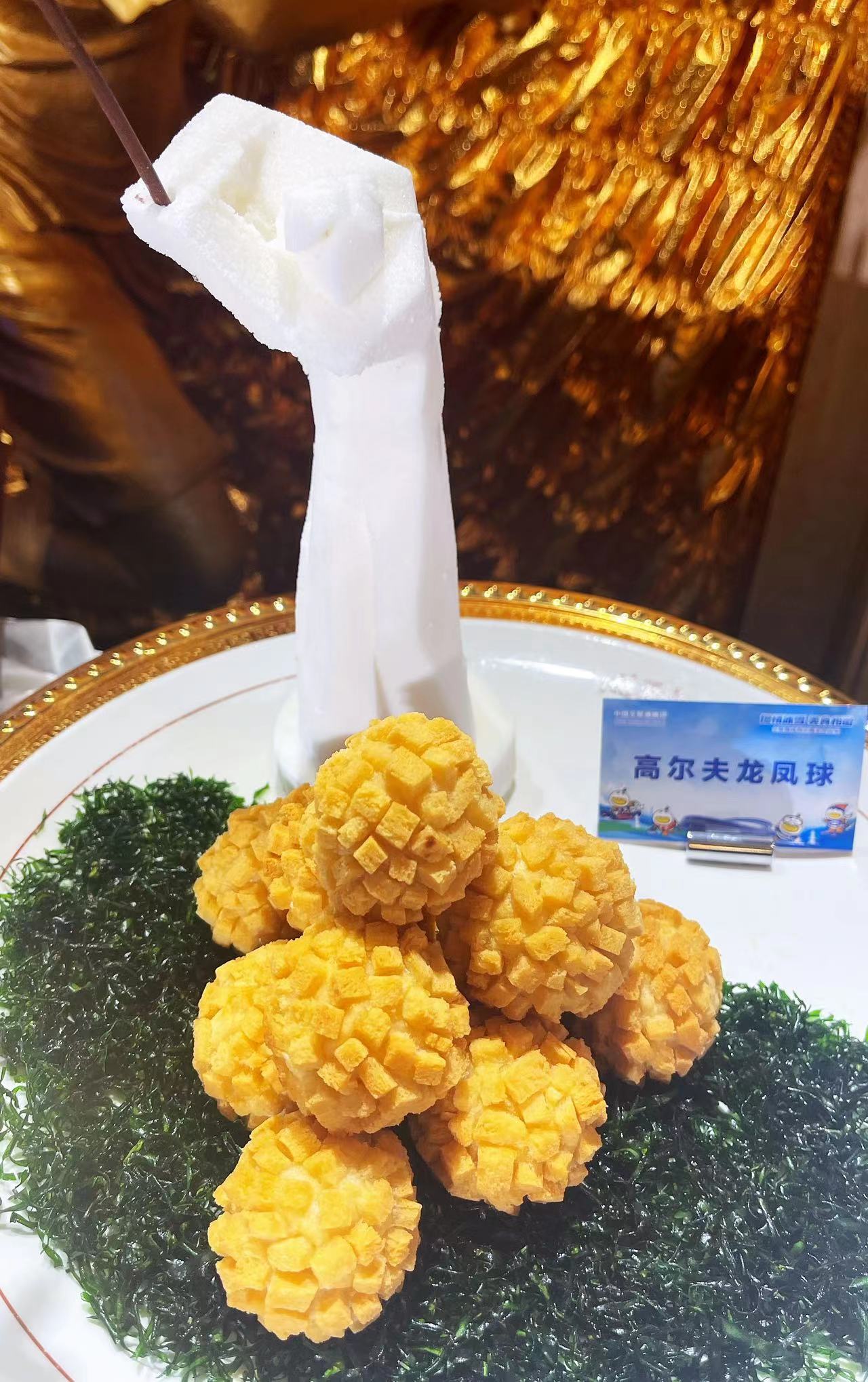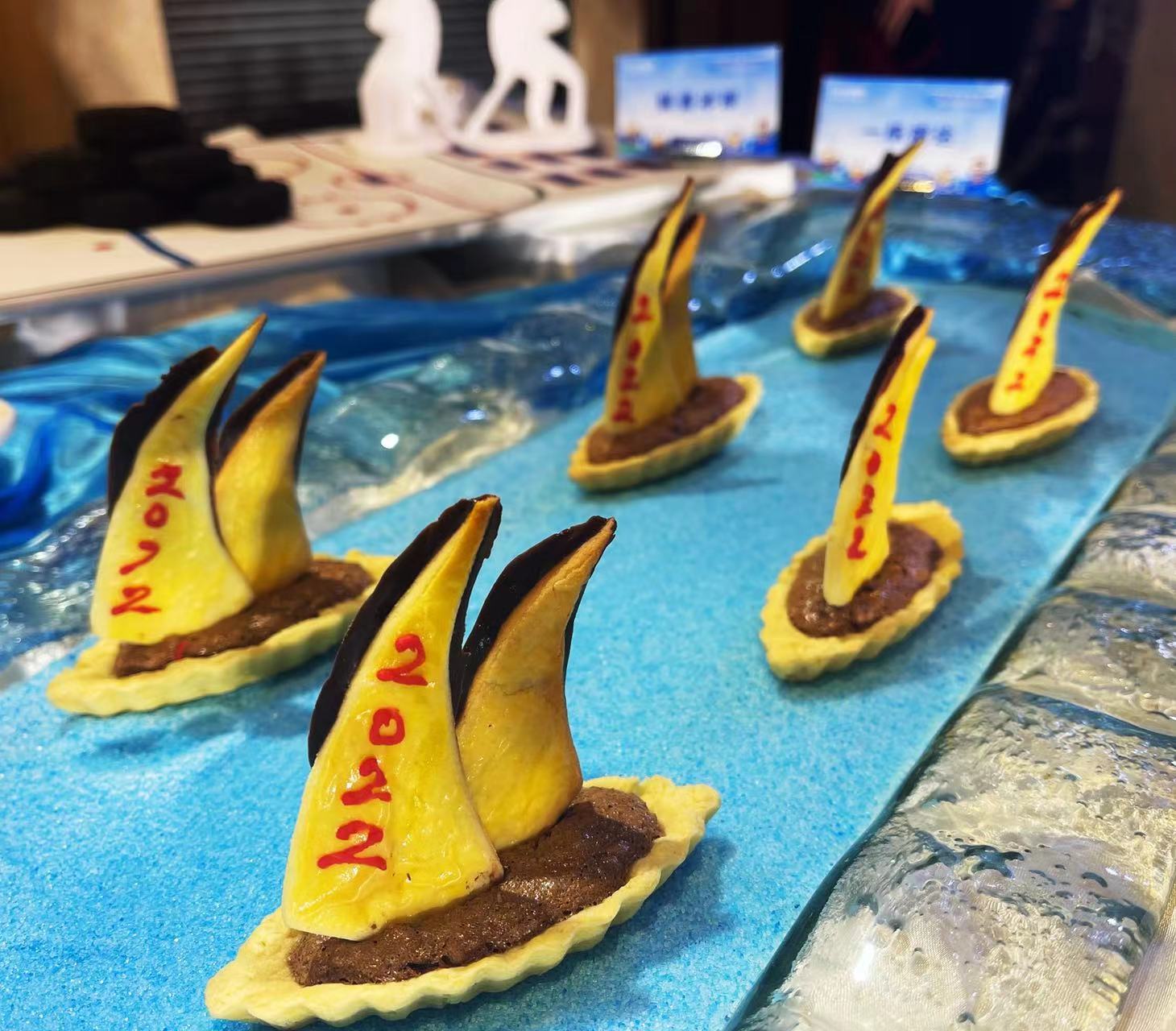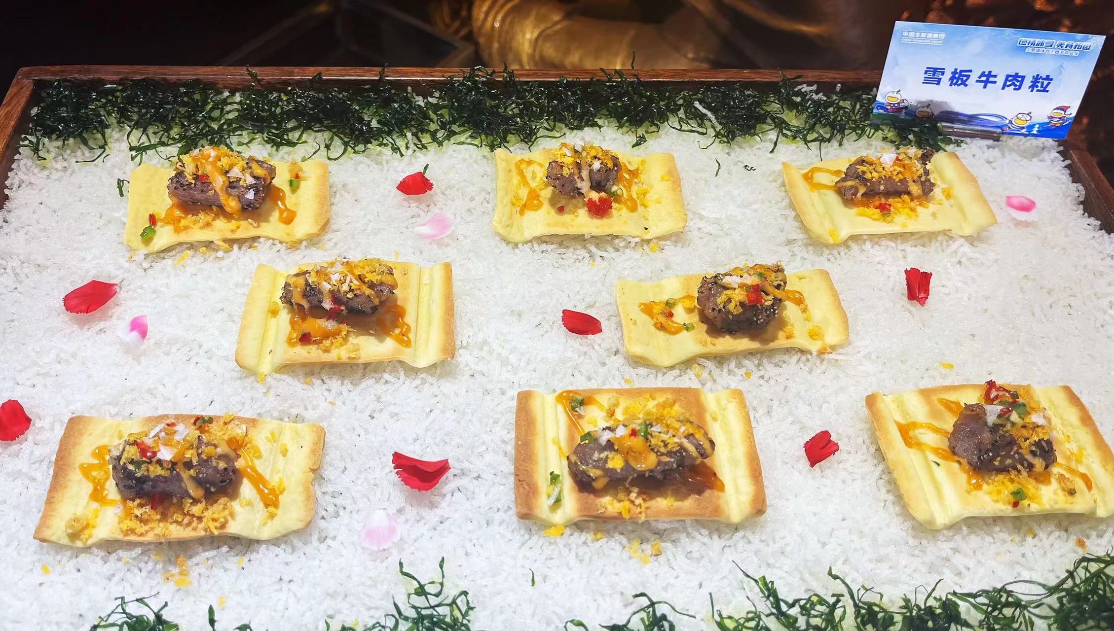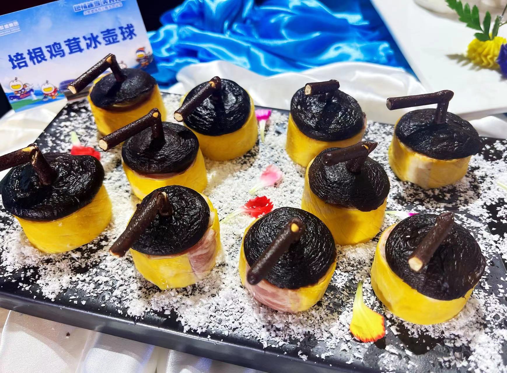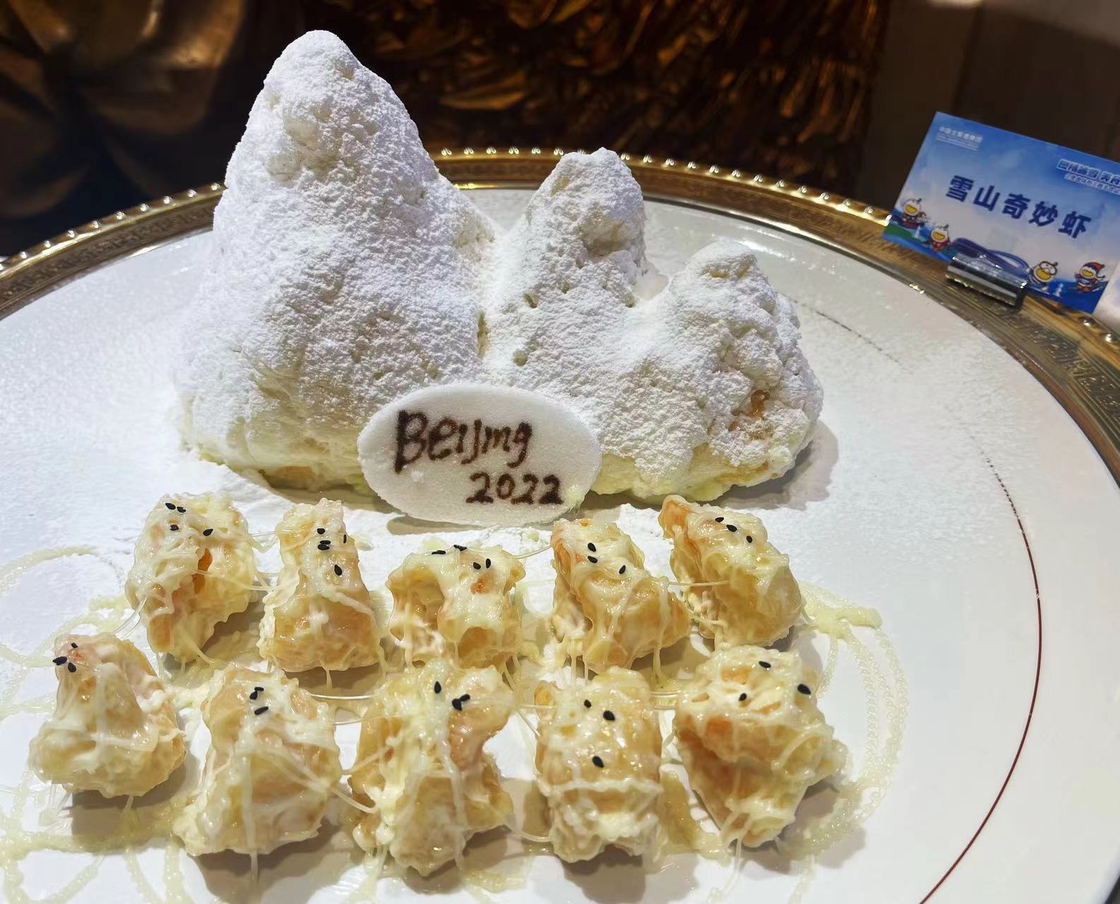 该店副总厨师长张刚介绍:“为了赶在2022年开年时把体育主题菜品奉献给广大食客,厨师们进行了为期6个月的研发。今天展示出的菜品有15道,包含冷菜、热菜和面点。”如冷菜“高山滑雪”,是用百合、山药等打成泥状和奶油、奶酪按一定配比制作而成,形似雪山,奶香浓郁。上面点缀的运动员造型是厨师用巧克力手工制成,犹如运动健将从雪山之巅潇洒滑下。双色冰球这道菜,是将山药和紫薯分别蒸熟后制成泥放入模具中定型,再由厨师用一双巧手将白色巧克力制成球网的形状,用黑色巧克力做成冰球运动员的造型,形象地还原了冰球运动的激烈赛场。雪板牛肉粒则是用制作饼干的方法,将黄油、面粉、鸡蛋、白糖搅拌均匀制作成滑雪板的样子,承托在菜品下方。上面摆放炸好的牛肉粒,搭配以运动员造型的巧克力小人,展现了运动员在雪板上恣意驰骋的风采。“雪山奇妙虾”利用蛋清打成高丽糊,做成雪山的形状进入烤箱定型制熟,再现朝阳下巍峨的雪山。前面的虾球裹上白色的酱汁,像一个个雪球般可爱。
