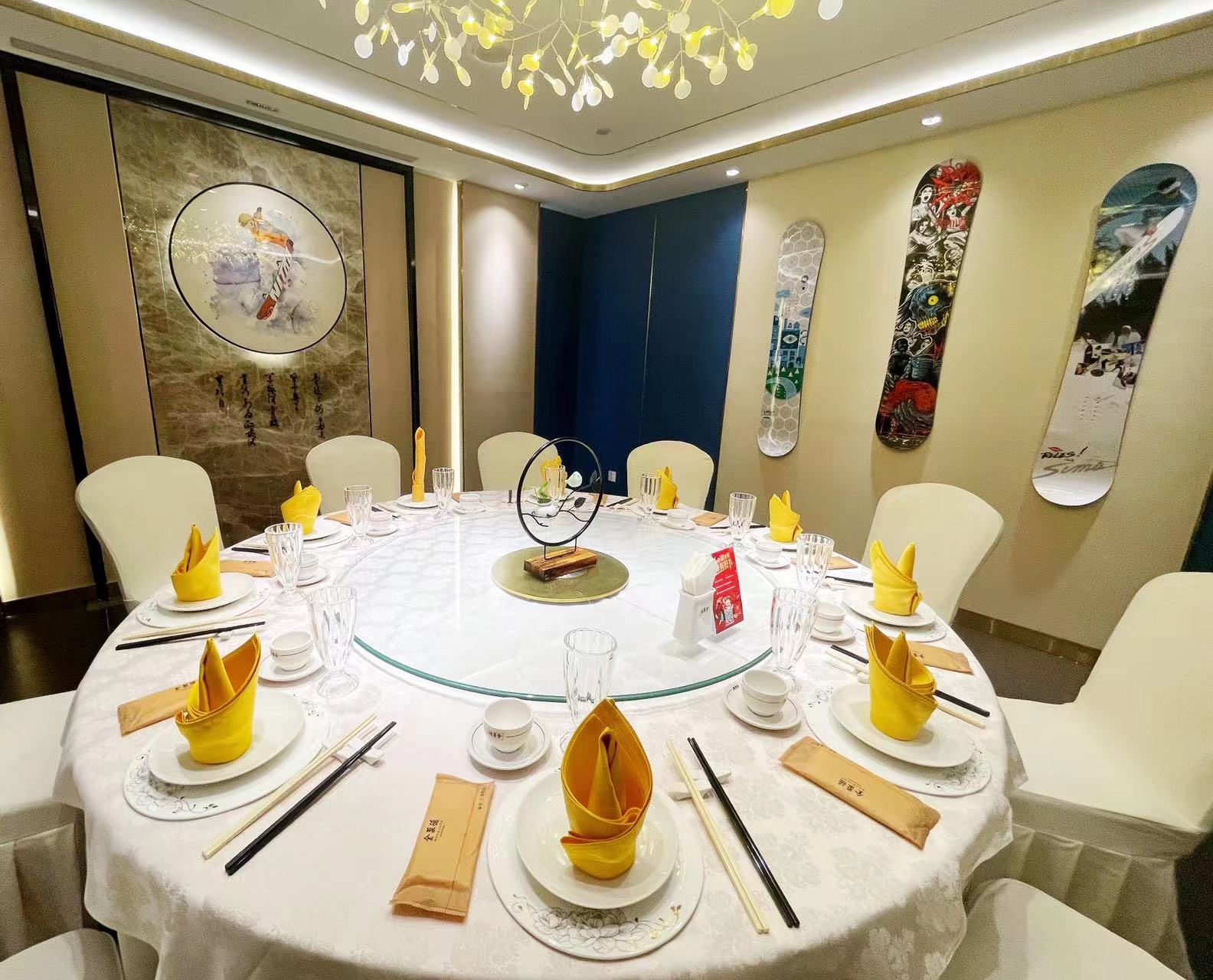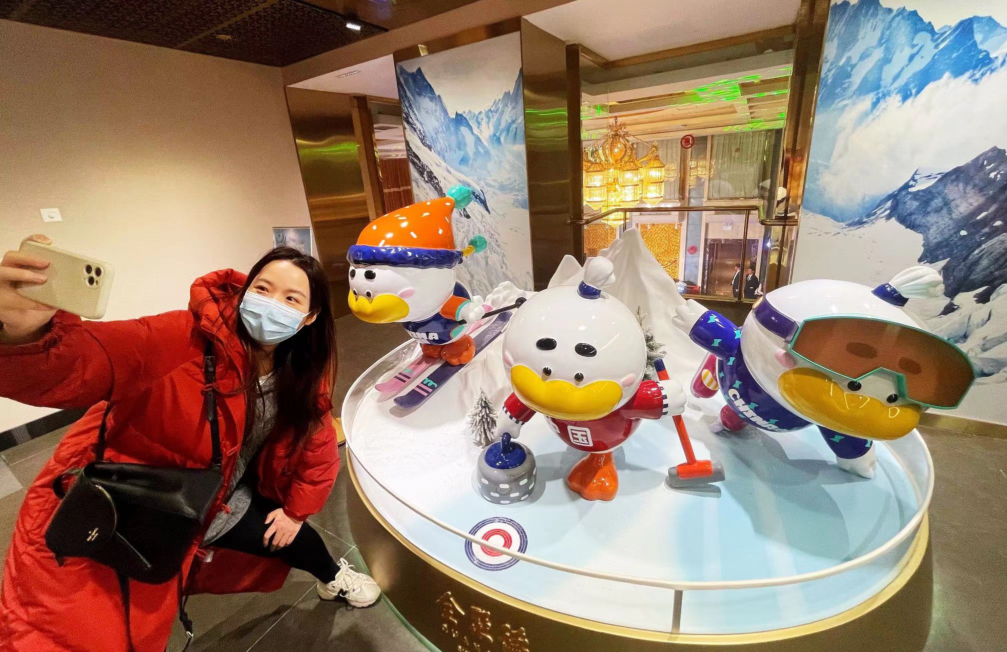 来到店内三层包间区域,迎面可见高山滑雪鸭、短道速滑鸭、冰壶鸭共三种可爱雕塑组成的小景观,成为顾客拍照打卡必选。元旦起,三层已变身冰雪主题沉浸空间。走廊的展柜里布置着冬季奥运会相关展品,如历届冬奥会胸针、2022年冬奥会和冬残奥会吉祥物衍生品、冰雪运动用具等。每个包间不仅以历届冬奥会主办城市命名,还着重在名牌上介绍了中国运动员在这届冬奥会上的傲人成绩。都灵包间门口的名牌上写着“韩晓鹏获得自由式滑雪男子空中技巧首枚金牌”,温哥华包间门口的名牌上,写着“申雪、赵宏博获得双人花样滑冰首枚金牌”……包间内的墙壁上也装饰着滑雪单板、冰球杆等冰雪运动用具。