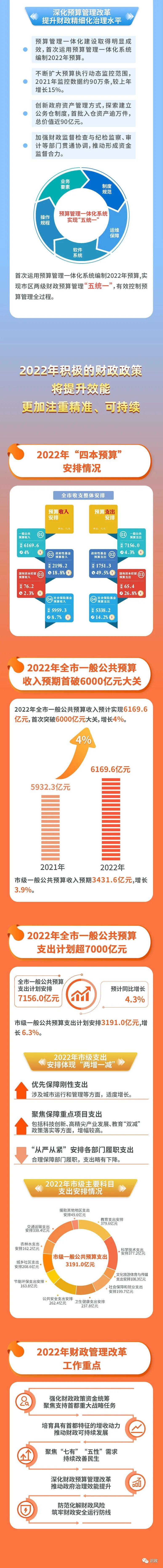 展望2022年,全市财政收支紧平衡状态仍将持续。2022年全市一般公共预算收入预期6169.6亿元,首次突破6000亿元大关,增长4%,与经济增长趋于吻合。支出上看,全市一般公共预算支出计划安排7156.0亿元,增长4.3%。
