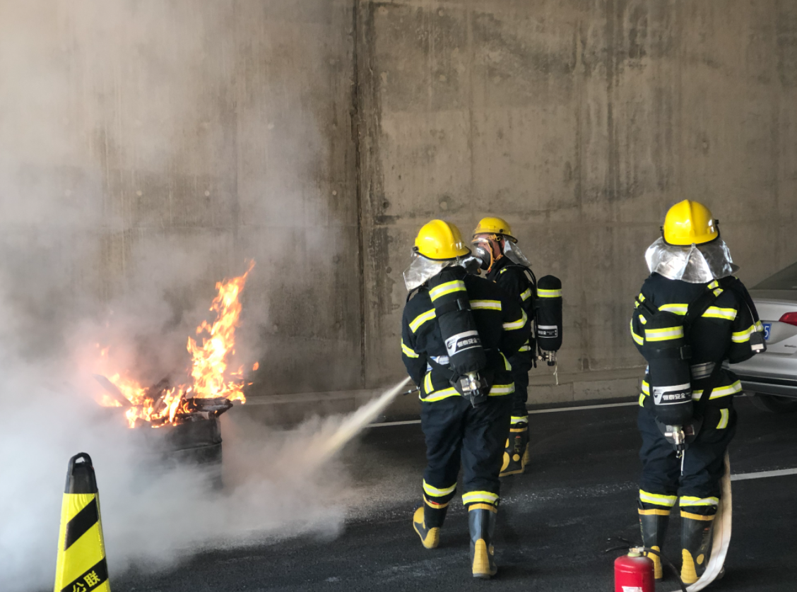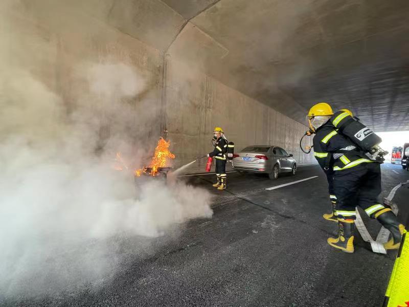 抵达现场后,救援人员启动了射流风机进行排烟,并通过广播系统引导滞留车辆及人员紧急疏散,对隧道进行双向封闭。紧接着,队员从事故现场附近消防箱内取出干粉灭火器,在起火点上风口3-5米处对火源根部进行喷射,另有2名人员来到事故车附近消火栓箱旁,取出水龙带连接消火栓,对事故车辆进行喷水降温,待消防车到达现场后协助消防人员扑灭火情。