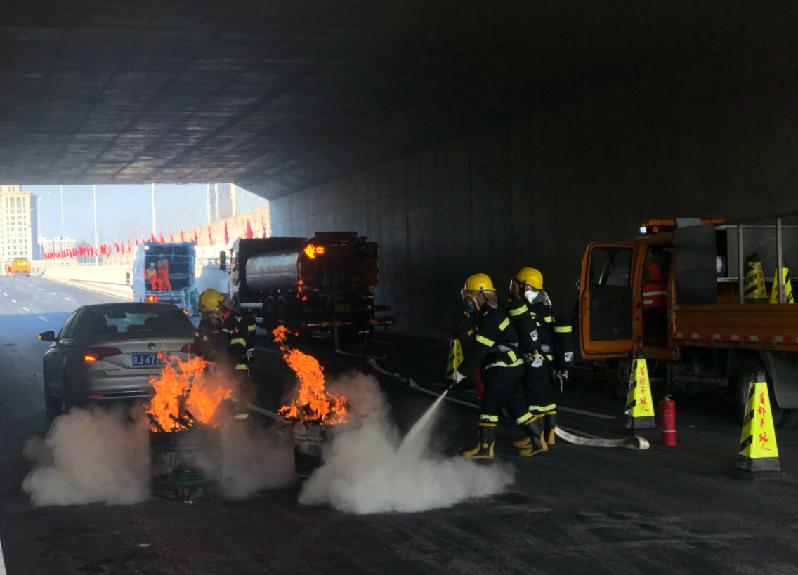 白色小轿车撞击隧道侧墙,车辆发动机舱冒起滚滚浓烟......1月6日15时,一场紧张惊险的道路救援在模拟的大屯路隧道上演。消防、交警、120、公联洁达应急抢险保障队四路人马迅速赶来增援,整套操作一气呵成,从事故发生到现场清障完毕只用了短短20分钟。为保障奥运场馆周边城市隧道运行安全,公联洁达联合消防、交管等部门组成“冬奥道路安全守卫队”,进行高效救援抢险。