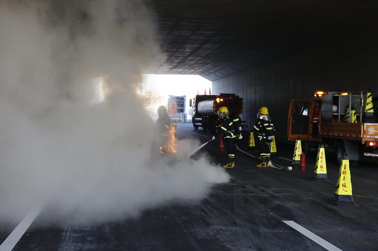 本次演练采用全流程、全要素、全实战演练,包含信息报送、联勤联动、队伍调动、消防救援、隐患排查、信息报送等全过程。按照演练流程,事故发生后,将立即启动应急预案,通知属地消防、交管部门,安排救援人员赶往现场封闭隧道、进行救援。首先对隧道进行封闭,启动射流风机进行排烟,通过广播系统引导滞留车辆及人员紧急疏散,并进行远端提示引导,随后由交通导行组、秩序维护组、抢险救援组进行抢险救援,最后由抢险人员进行现场清理后恢复交通。
