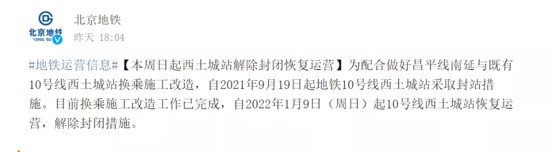 昨天下午,北京地铁官微发布消息,本周日起西土城站解除封闭恢复运营。目前,昌平线南延与既有10号线西土城站换乘改造施工已经完成,自2022年1月9日(周日)起10号线西土城站恢复运营,解除封闭措施。