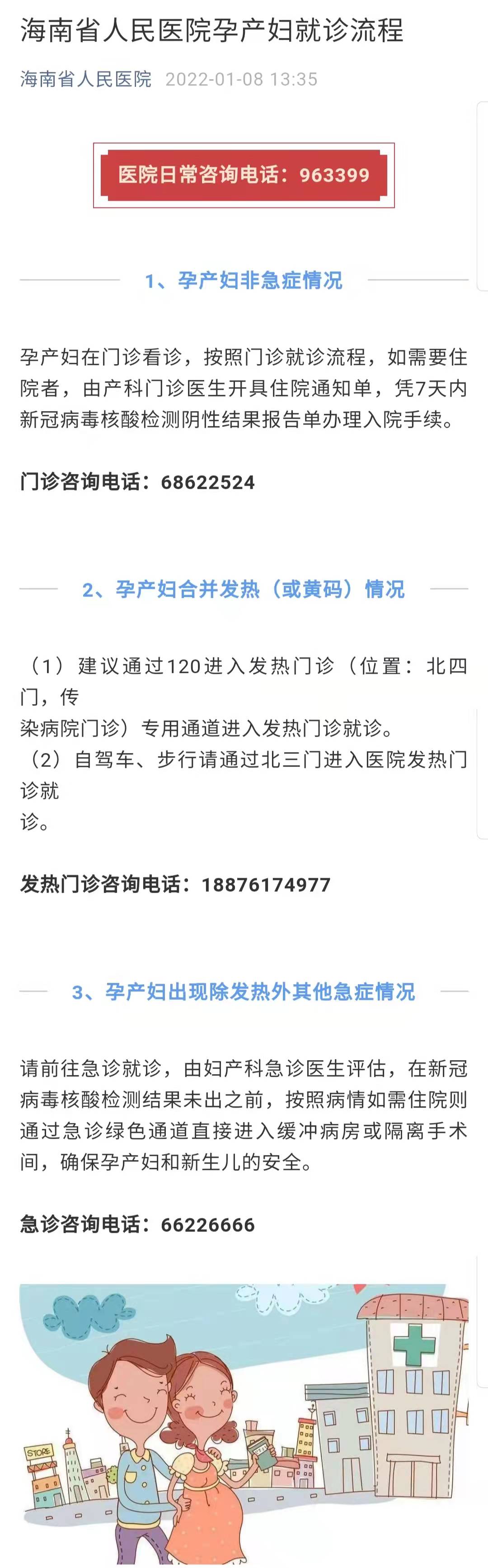 近日,新冠肺炎疫情常态化防控下孕产妇就诊问题备受关注。1月8日,海南省人民医院发布孕产妇就诊流程,非急症孕产妇在门诊就诊,持核酸检测阴性结果住院;孕产妇合并发热(或黄码)情况可到发热门诊就诊;孕产妇出现除发热以外其他急症情况,可通过急诊绿色通道直接进入缓冲病房或隔离手术间。同时,公布了相关咨询电话。